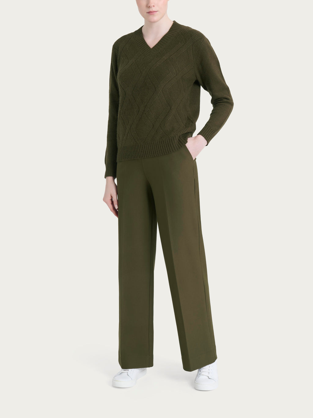 Maglia con scollo a V e con trecce in Natural Soft - Dark Olive