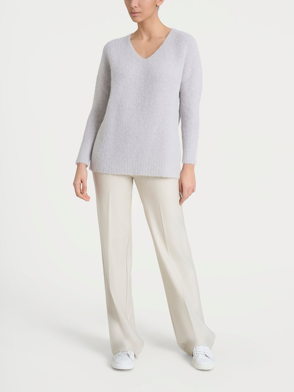 Maglia con scollo a V da donna in misto lana e alpaca, tessuto in finezza 7, caldo, soffice e voluminoso.