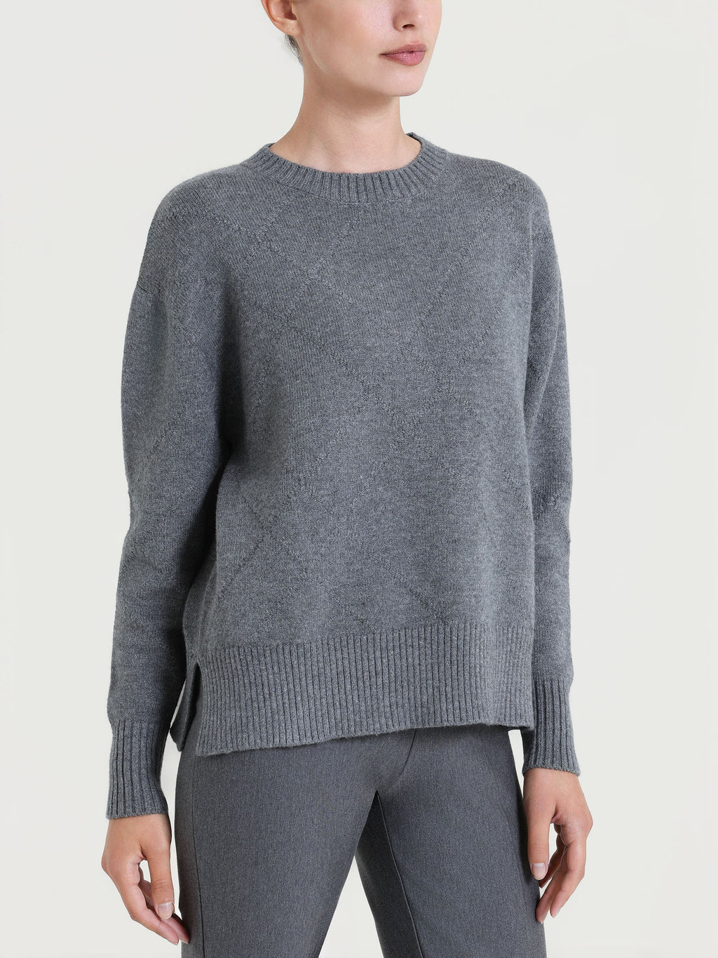 Realizzato in morbida maglia rasata ha una bordatura in costa 2x2 che impreziosisce sia il fondo che i polsini, oltre a definire con eleganza lo scollo, conferendo al design un tocco di struttura.