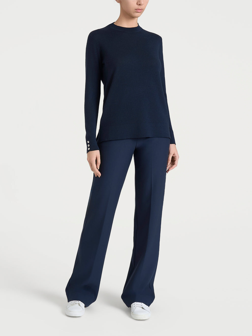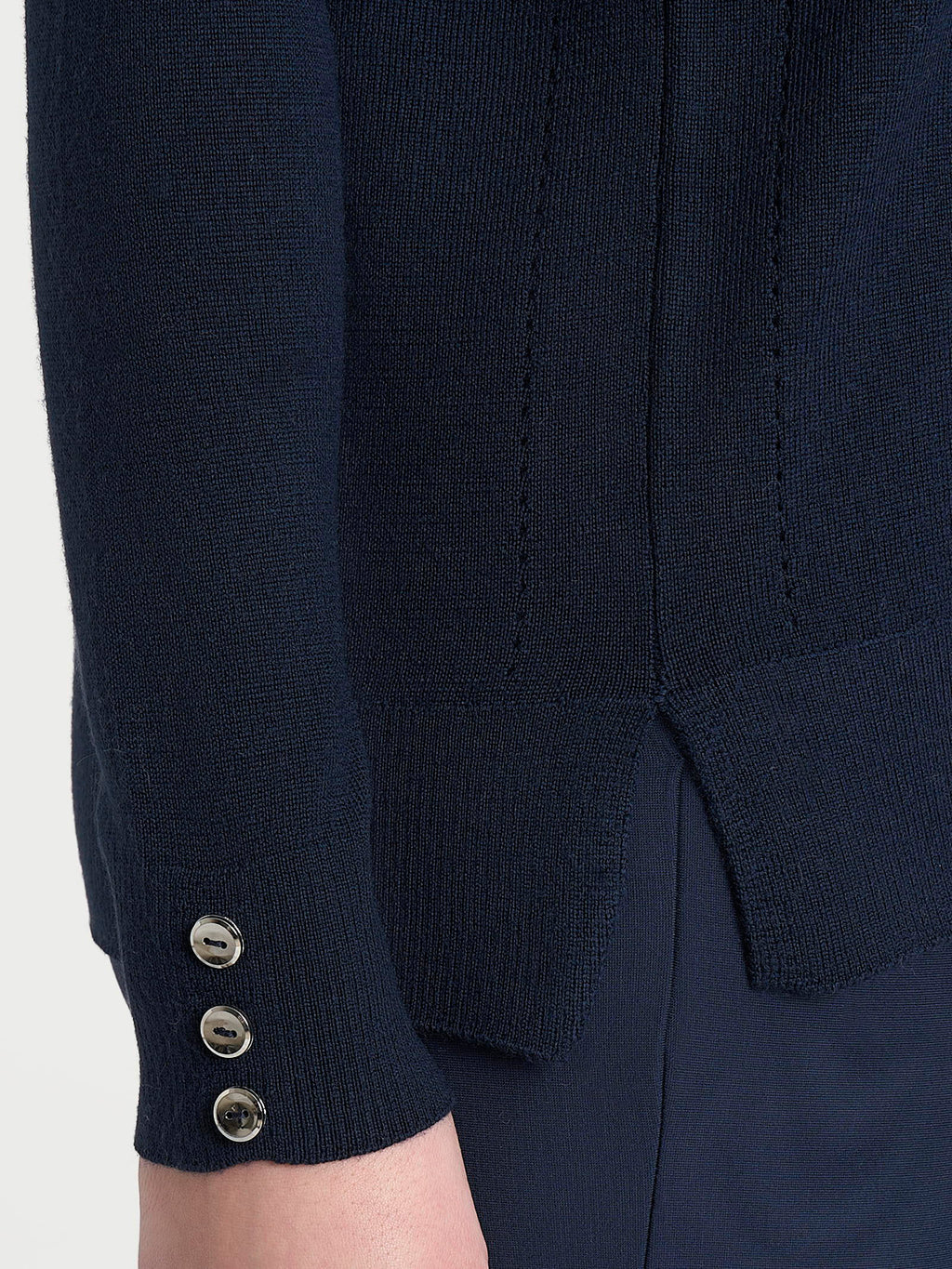 Distintivo è il dettaglio sui polsini, tre bottoncini applicati che donano un tocco di stile discreto ma ricercato.