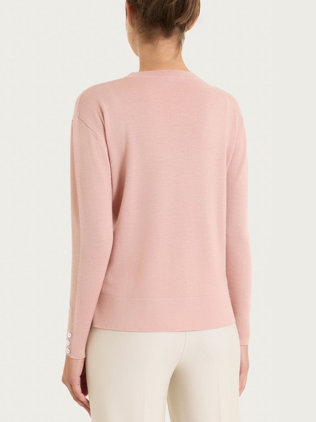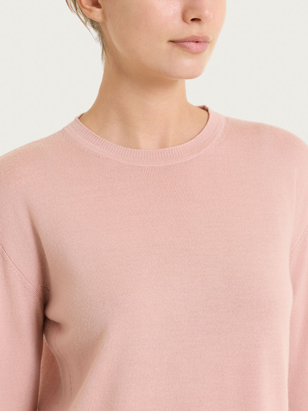 Maglia da donna in maglia rasata con manica lunga in finezza 12. Questo modello è caratterizzato dal girocollo che è delineato da una costina 2x1 che richiama la medesima presente anche sui bordi e...