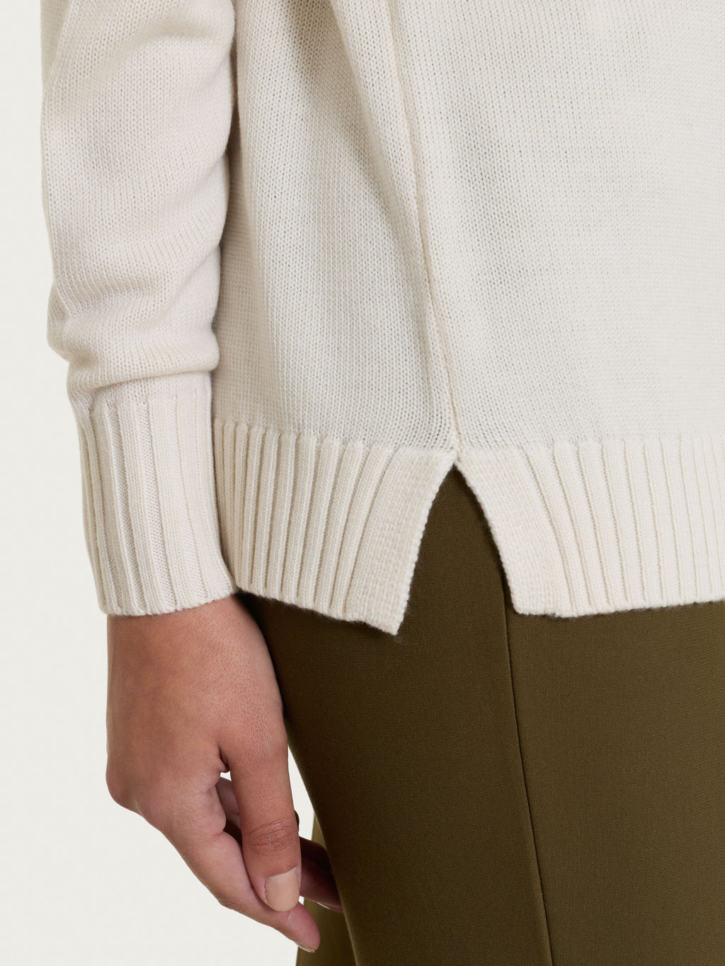 Questo modello è caratterizzato dal girocollo che è delineato da una costina 3x3 che richiama la medesima presente anche sui bordi e sul fondo.