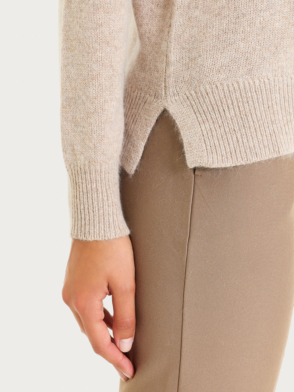 Gli spacchetti laterali introducono un elemento di stile, mentre la finitura in costina 1x1 rifinisce con sobrietà e precisione i bordi del capo.
