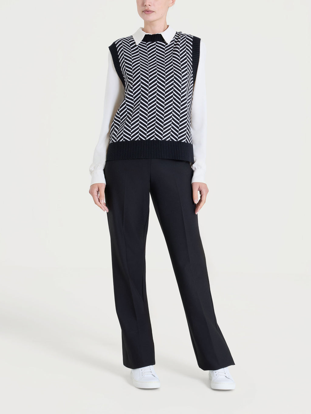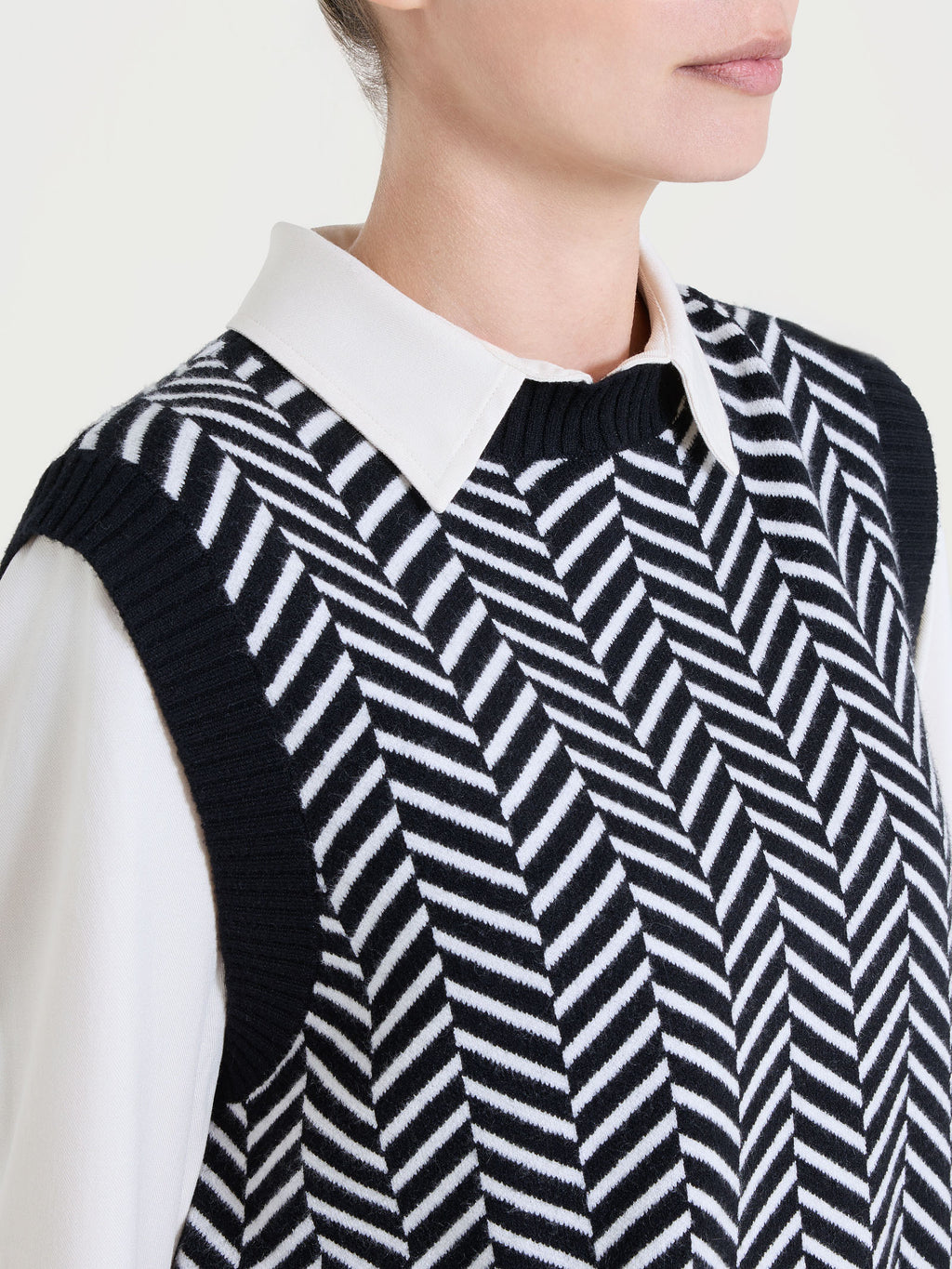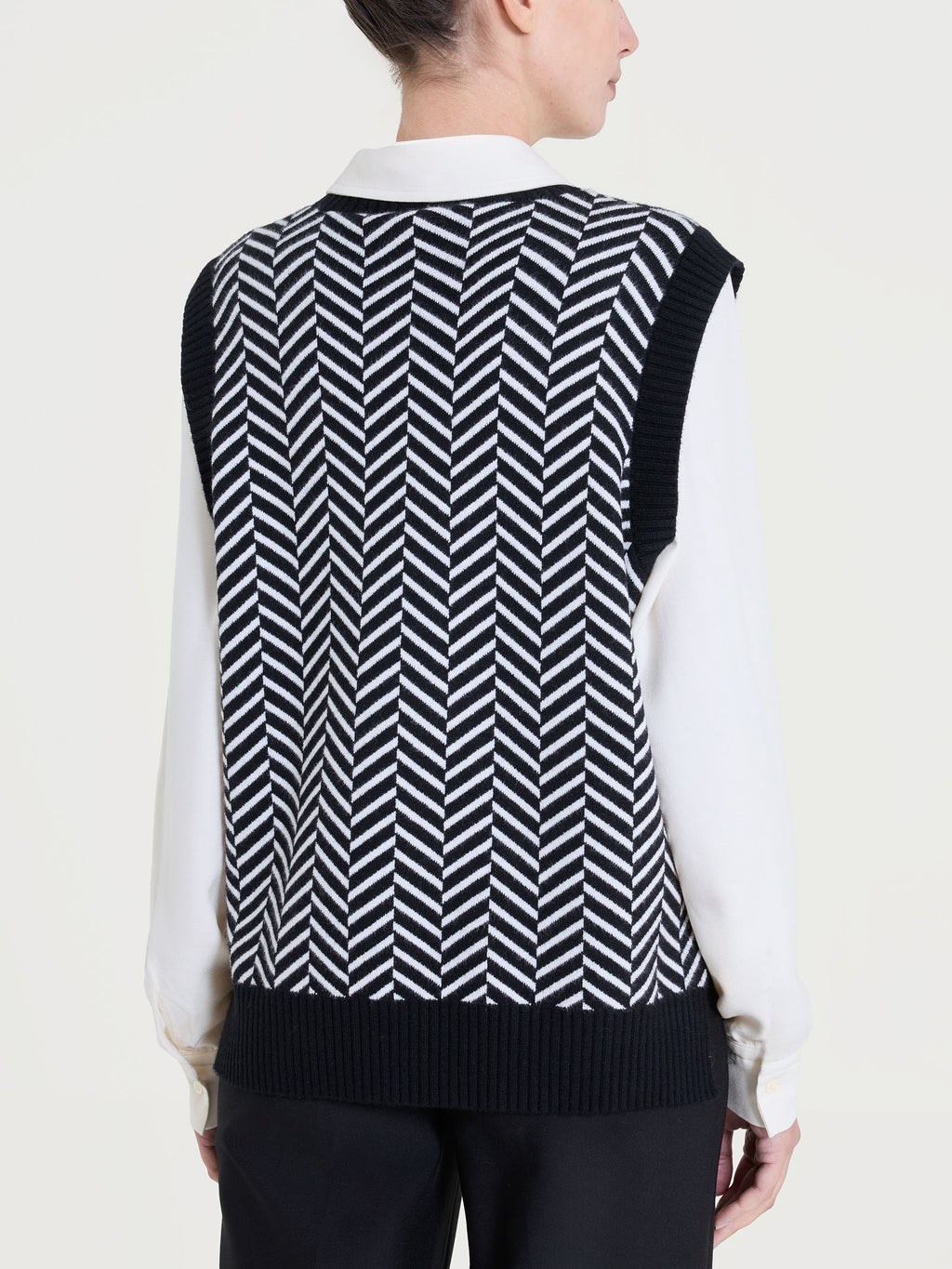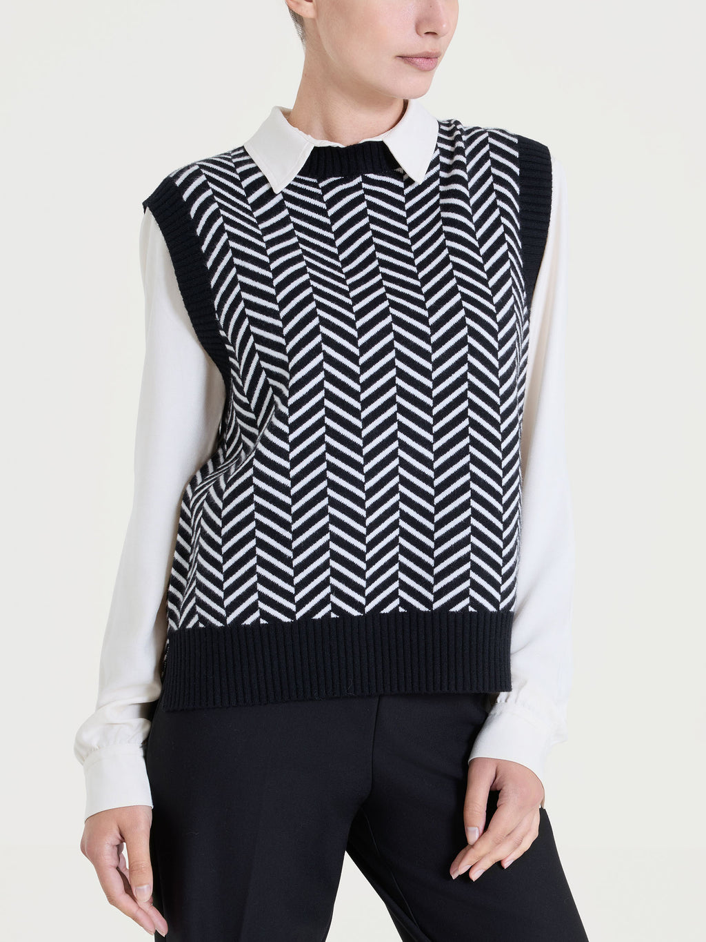 Maglia smanicata da donna in misto viscosa, tessuto in finezza 12, caldo e confortevole.Caratterizzata da una fantasia spigata, un motivo grafico, sotti...