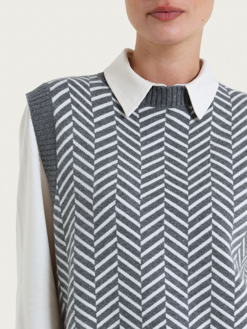 Maglia smanicata da donna in misto viscosa, tessuto in finezza 12, caldo e confortevole.