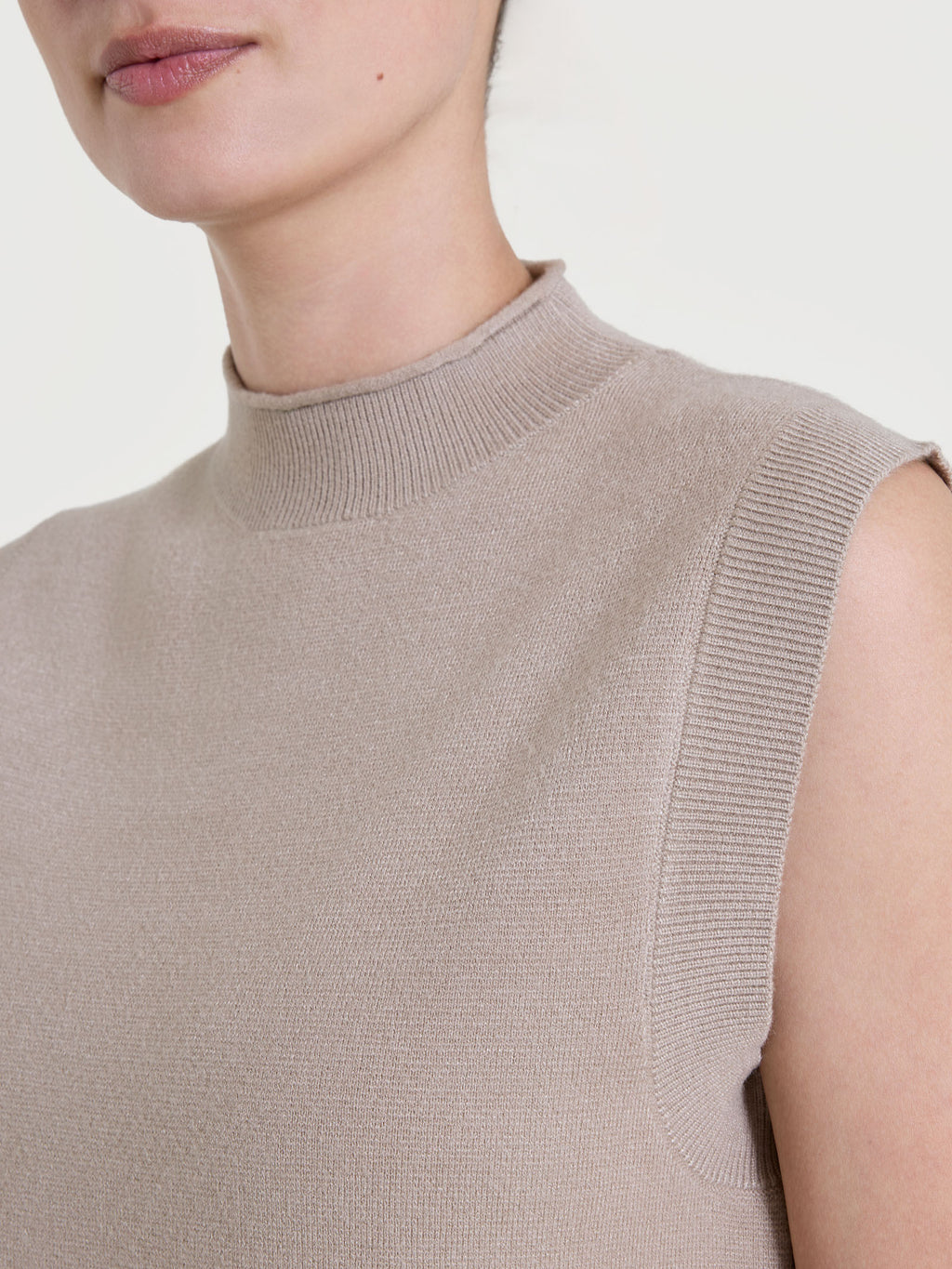 Questo modello con collo lupetto e senza maniche si adatta facilmente a tutte le stagioni, donando un leggero strato di copertura per i giorni caldi e uno strato base per quelli più freddi.