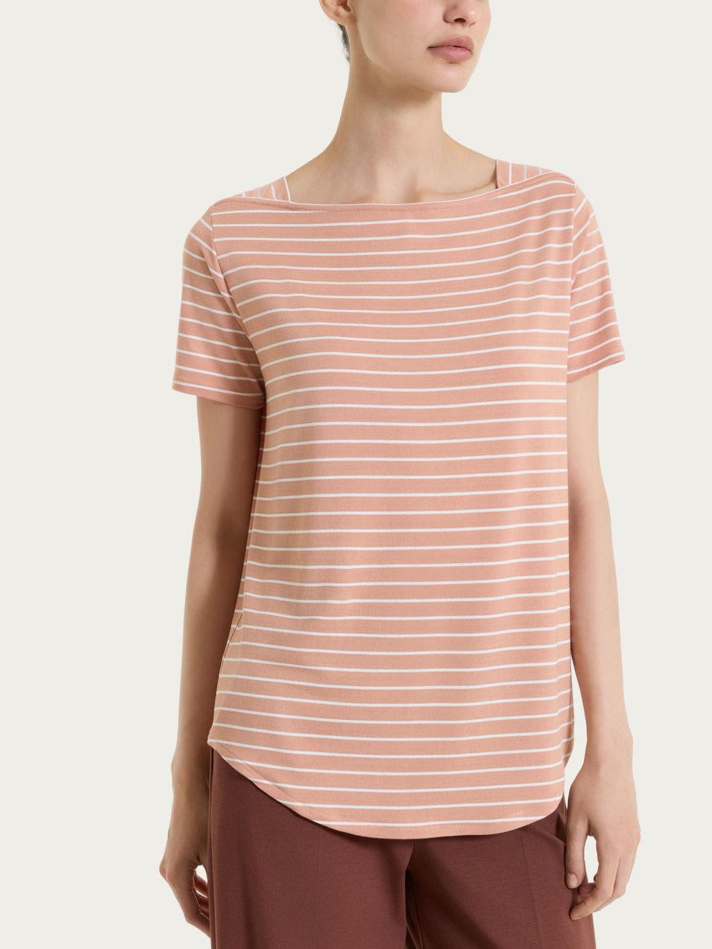 Maglietta da donna con collo a barchetta realizzata in Summer Light Piquet, una viscosa leggera ed elasticizzata, fresca e confortevole sulla pelle.