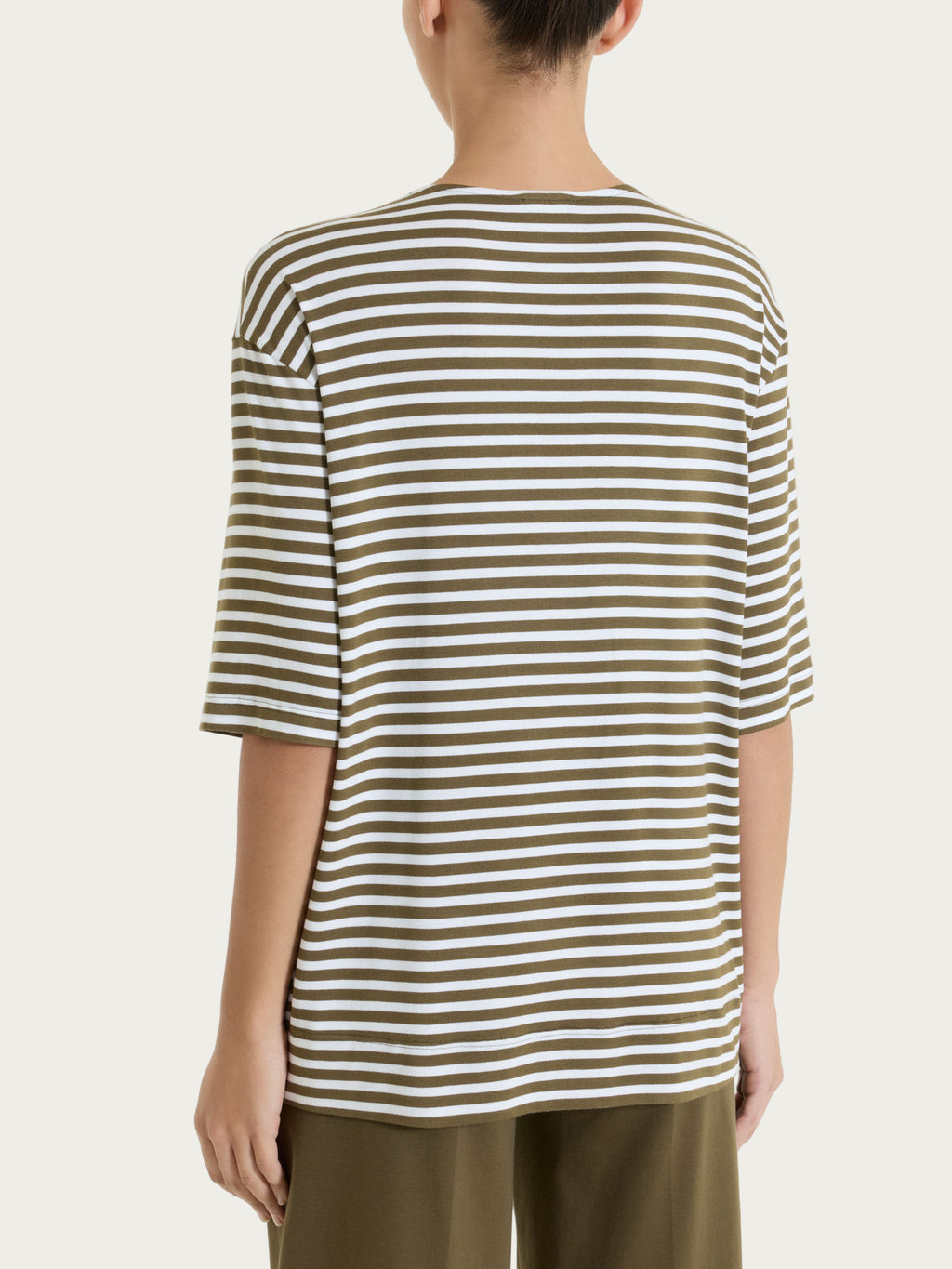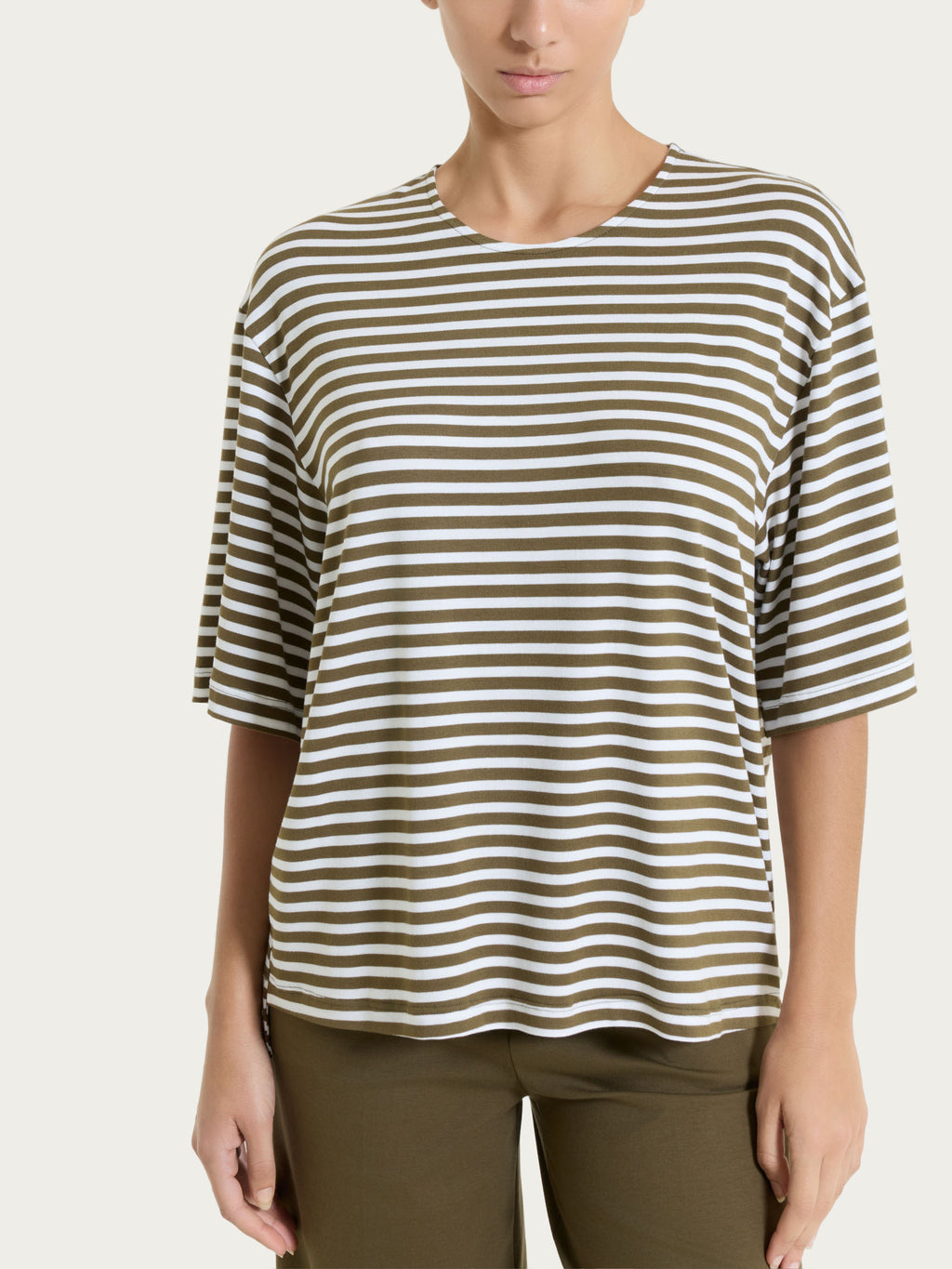 Maglietta da donna con girocollo e manica al gomito, dal design essenziale e contemporaneo.La fantasia a righe classiche alternate richiama un’estetica ...