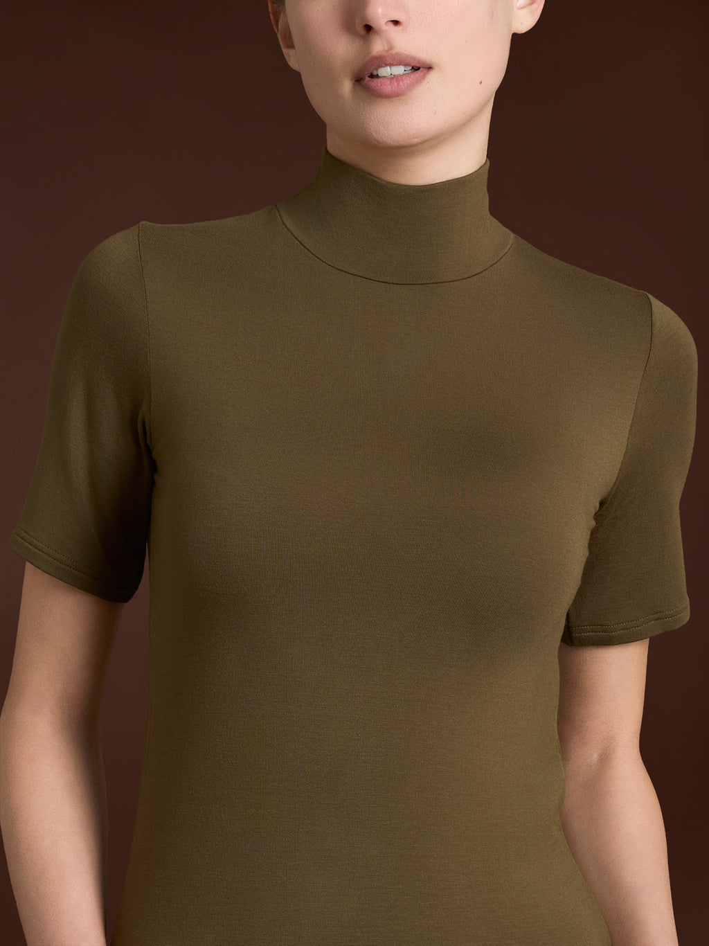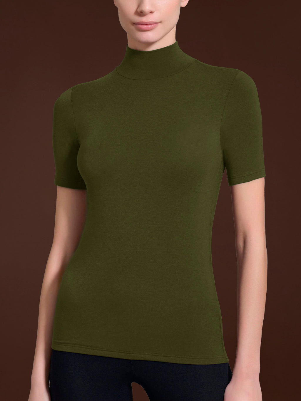 Maglietta con collo alto a lupetto e manica corta da donna in jersey di viscosa elasticizzata.