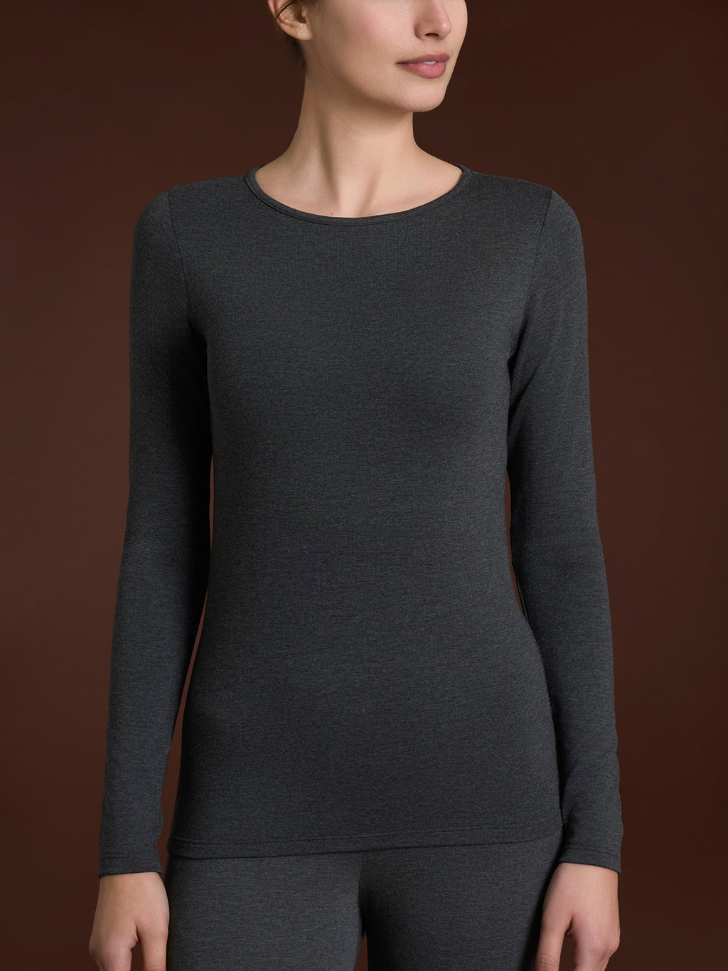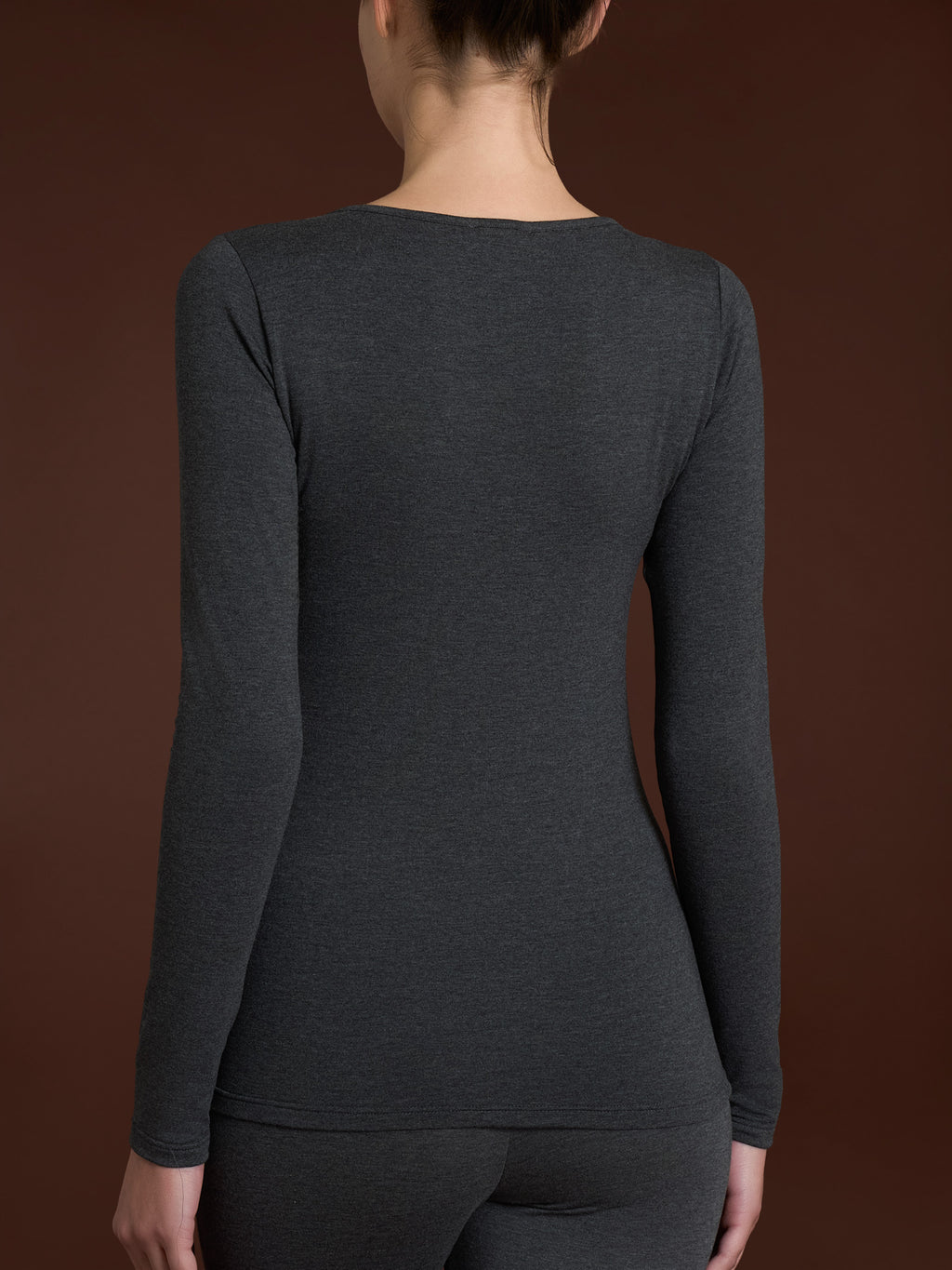 Maglia con scollo a barchetta e manica lunga da donna in ecoviscosa, una delicata viscosa elasticizzata calda e morbida.