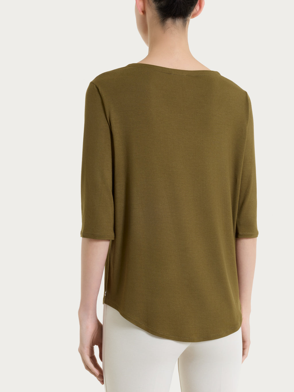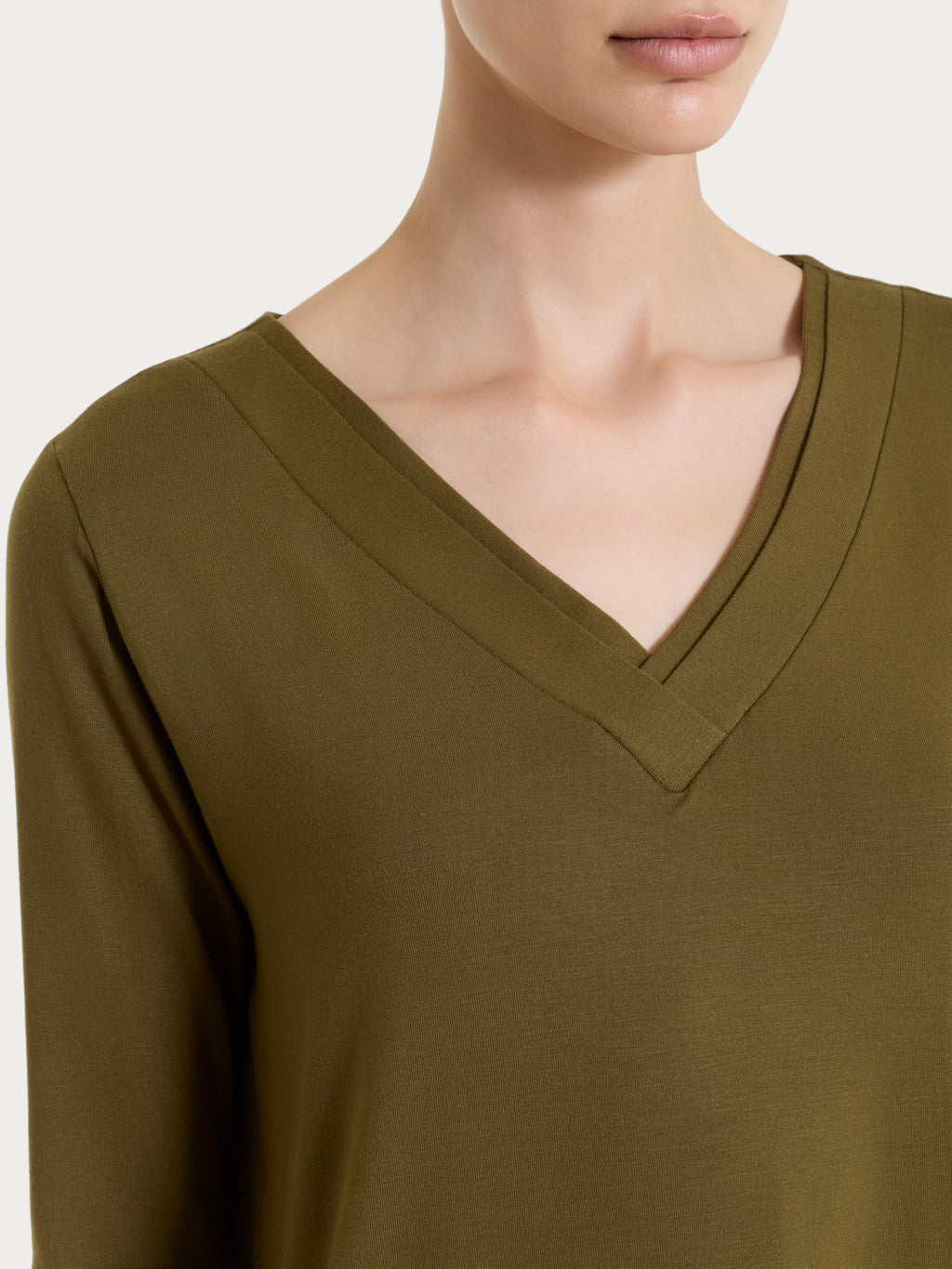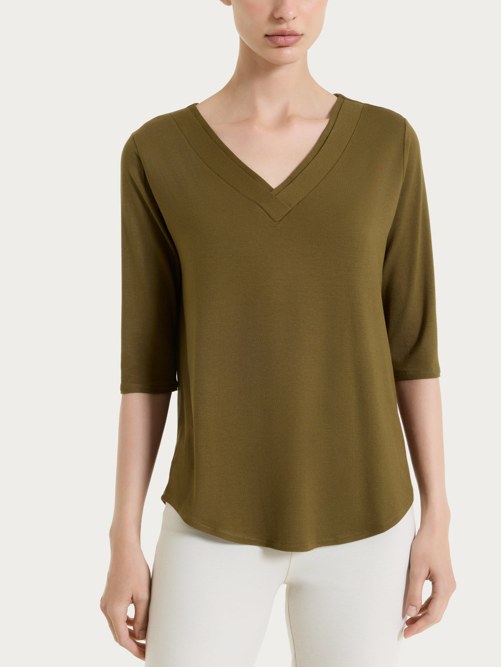 Il modello è valorizzato dallo scollo a V con incrocio, un dettaglio che definisce la scollatura in modo elegante e slancia la figura, aggiungendo movimento alla linea del capo. La manica 3/4 completa il design rendendolo pratico e versatile, ideale per le mezze stagioni e per le giornate più miti.