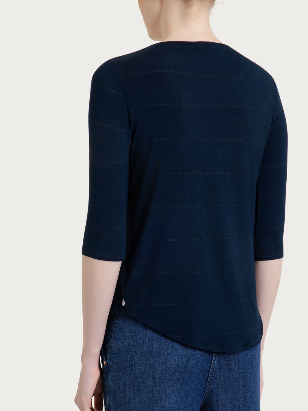 Maglietta da donna con girocollo e manica 3/4, dal look leggero e luminoso.Il capo è caratterizzato da una fantasia a micro righe in lurex, un dettaglio...
