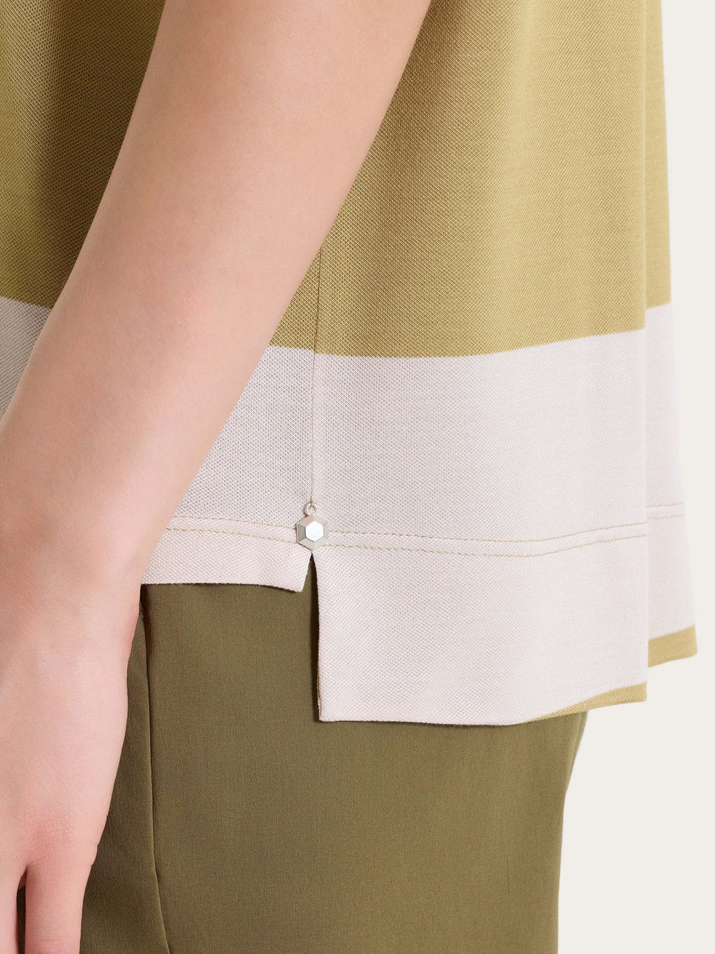 Protagoniste assolute sono le macro righe orizzontali, grafiche e d’impatto: un motivo essenziale ma forte, che dà ritmo al capo e rende immediato anche l’abbinamento più semplice.