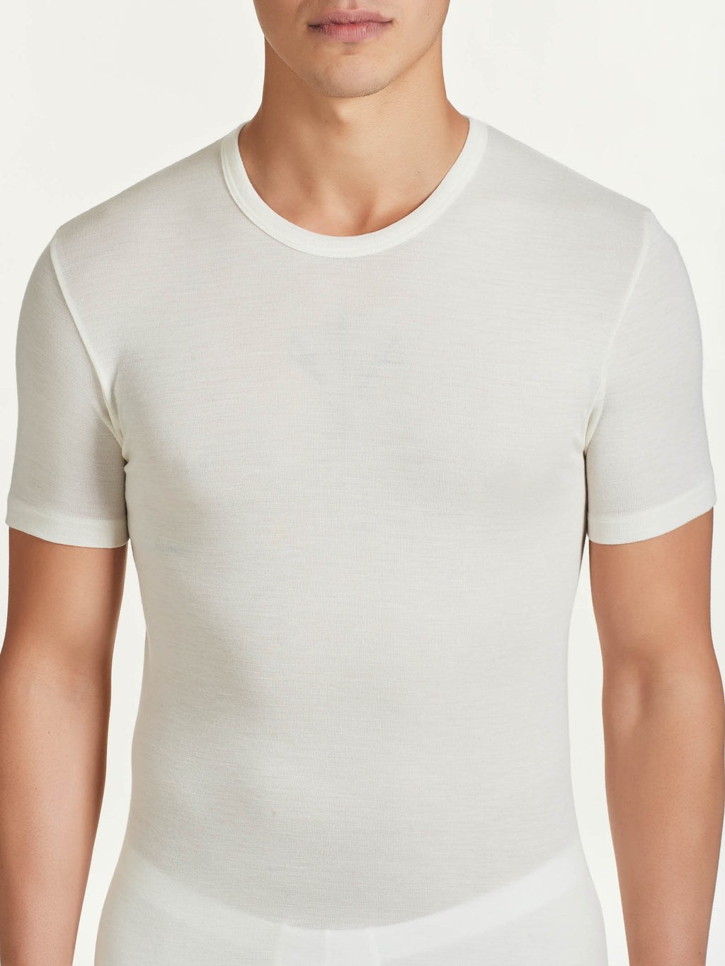 Maglietta girocollo a manica corta in preziosa maglia unita di lana e seta.