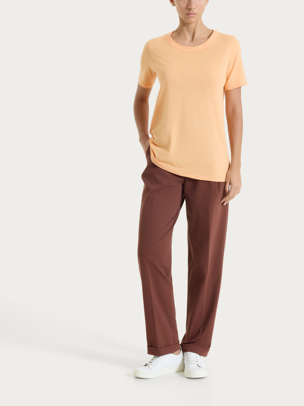 T-shirt girocollo da donna con la manica corta.Questo capo è classico e senza tempo, noto per la semplicità e versatilità.Realizzato in freschissimo slub jersey, un tessuto realizzato con filato fi...
