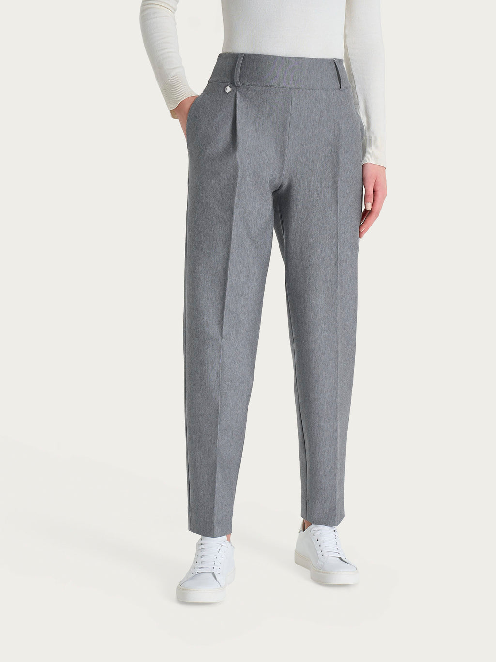 Caratterizzato dalla presenza di comode tasche laterali ed eleganti pinces, questo modello è costruito con vita elasticizzata ma con i passanti per la cintura per permetterti di aggiungere quel tocco di stile personale in più, comodo come indossare un leggings pur mantenendo l'eleganza di un pantalone.