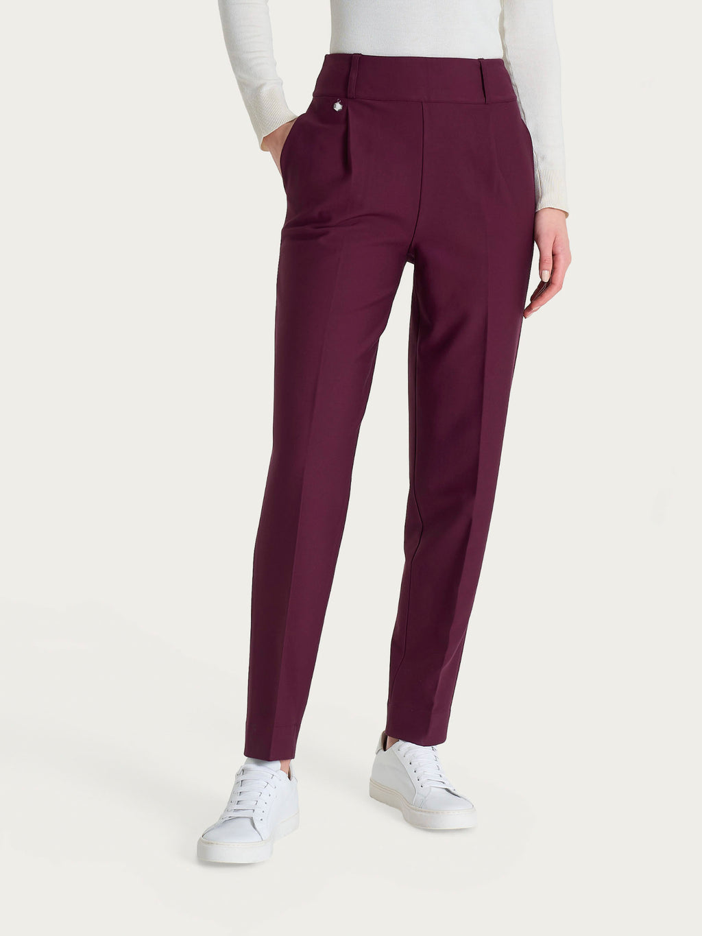 Caratterizzato dalla presenza di comode tasche laterali ed eleganti pinces, questo modello è costruito con vita elasticizzata ma con i passanti per la cintura per permetterti di aggiungere quel tocco di stile personale in più, comodo come indossare un leggings pur mantenendo l'eleganza di un pantalone.