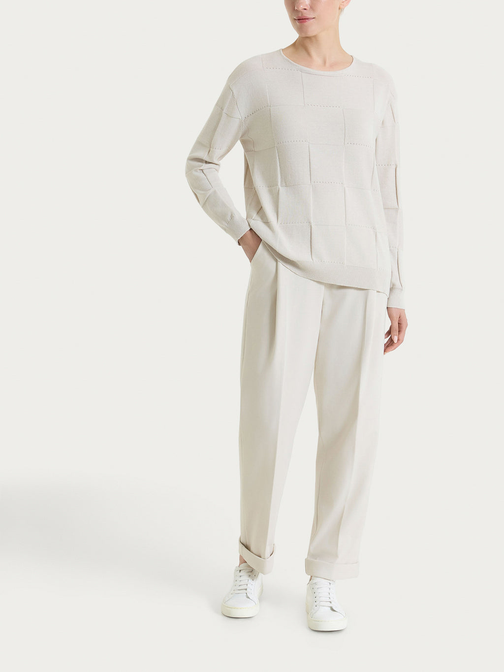 Il taglio a carota offre una vestibilità contemporanea, mentre le tasche consentono di tenere a portata di mano oggetti essenziali. Il risvolto regolabile aggiunge versatilità al design, permettendo di personalizzare la lunghezza del pantalone in base alle esigenze.
