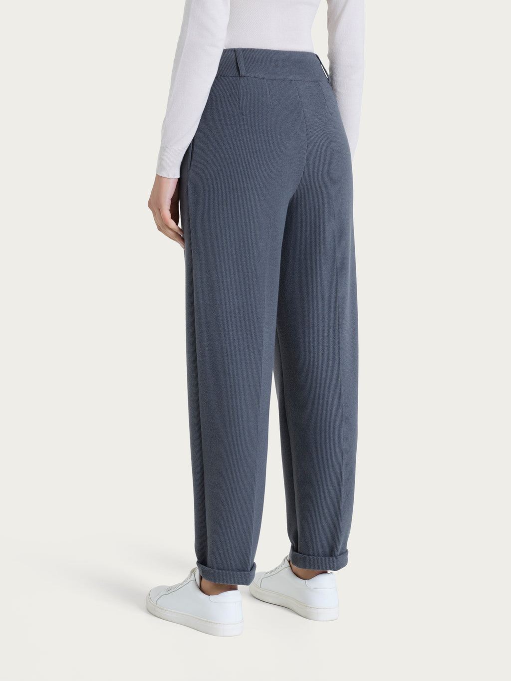 Pantalone a carota da donna con vestibilità tapered, la gamba leggermente ampia si stringe verso la caviglia.