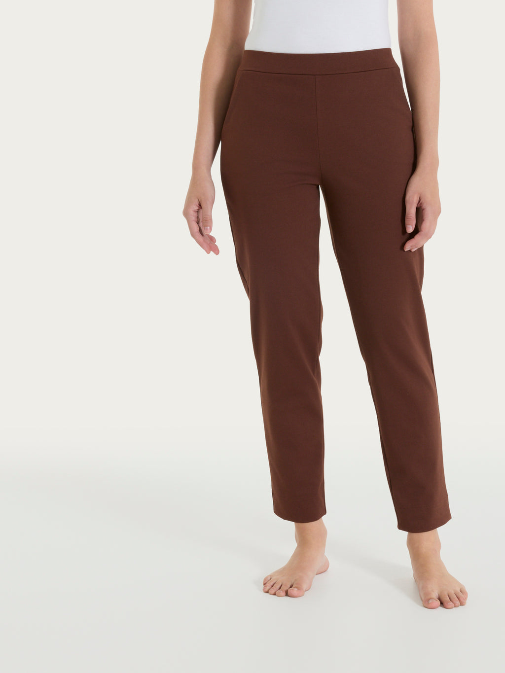 Pantalone a carota da donna con vestibilità tapered, la gamba leggermente ampia si stringe verso la caviglia con lunghezza alla caviglia cropped.