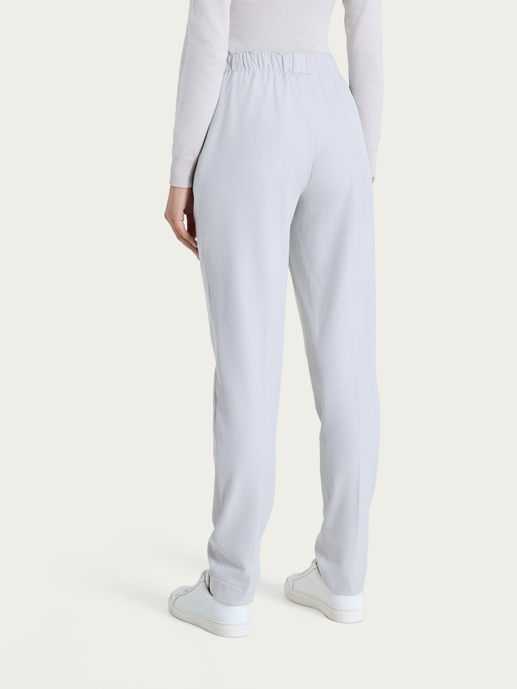 La vita elasticizzata si adatta con naturalezza alla figura, offrendo una vestibilità comoda e definita, senza costringere. Le tasche alla francese aggiungono eleganza e praticità, rendendo il capo versatile e curato nei dettagli. Il fondo del pantalone può essere facilmente risvoltato, per un look più disinvolto e personalizzato, perfetto per adattarsi a diverse occasioni o gusti di stile.