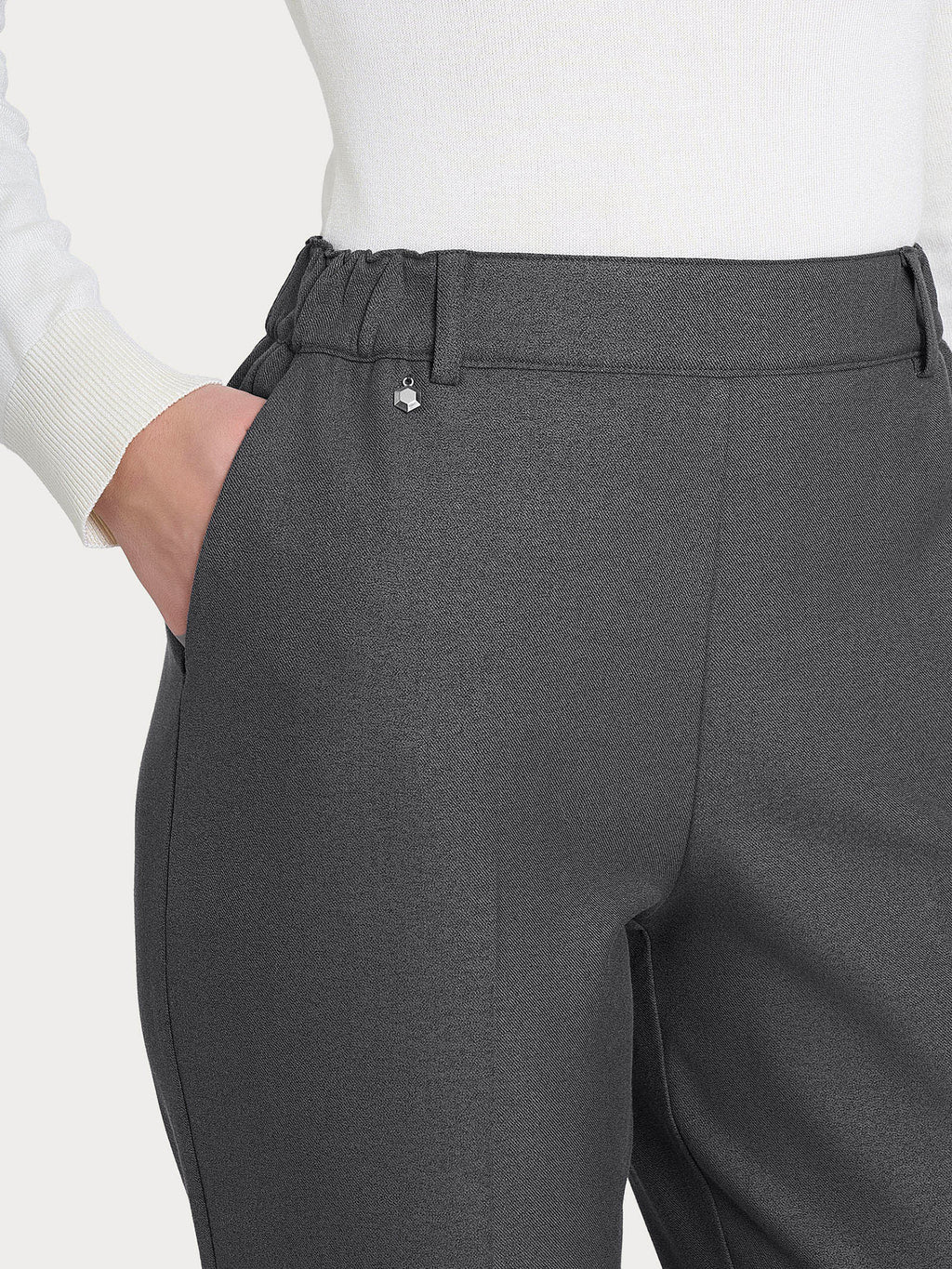 Questo modello presenta una vita elasticizzata che garantisce comfort e praticità, arricchita da passanti per cintura.