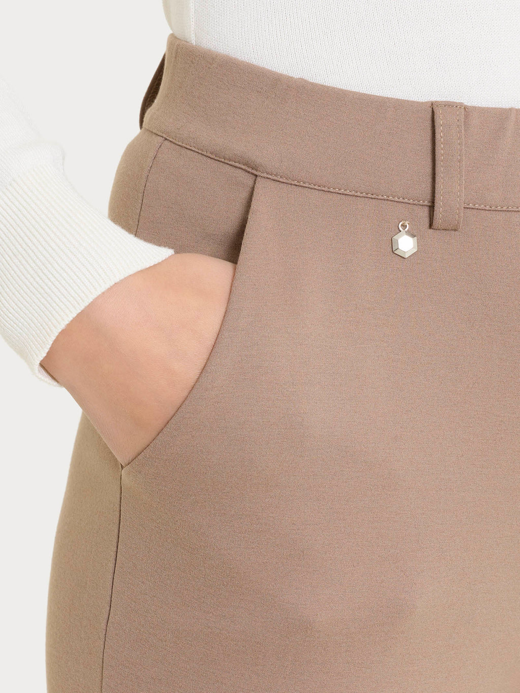 La vita elasticizzata segue armoniosamente le linee del corpo, offrendo una vestibilità confortevole e ben definita, mentre le tasche alla francese uniscono funzionalità e stile.