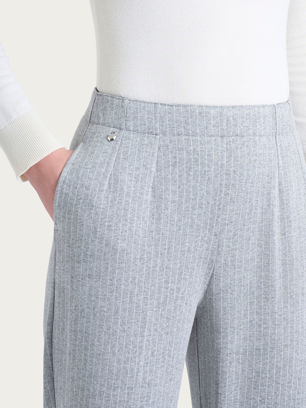 Questo modello gessato con sottili righe verticali è costruito con vita elasticizzata e senza zip, ma con pratiche tasche laterali. Il risvolto regolabile con piccolo spacchetto finale rende possibile la personalizzazione del look secondo le esigenze di stile e preferenze personali.