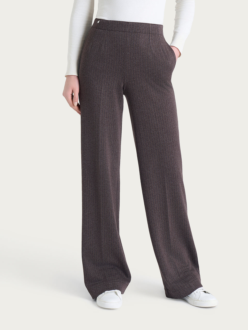 Questo modello gessato con sottili righe verticali è costruito con vita elasticizzata e senza zip, ma con pratiche tasche laterali.