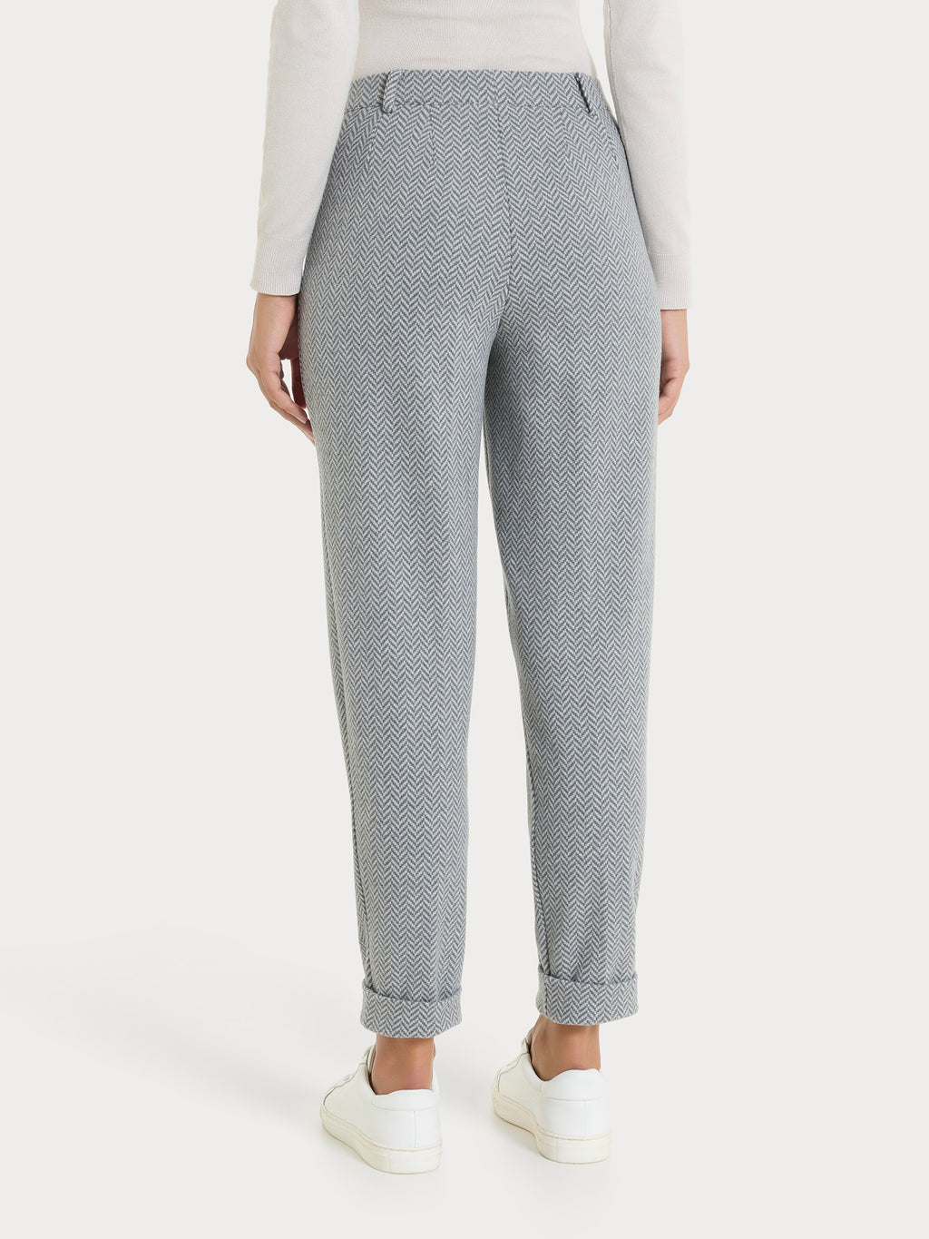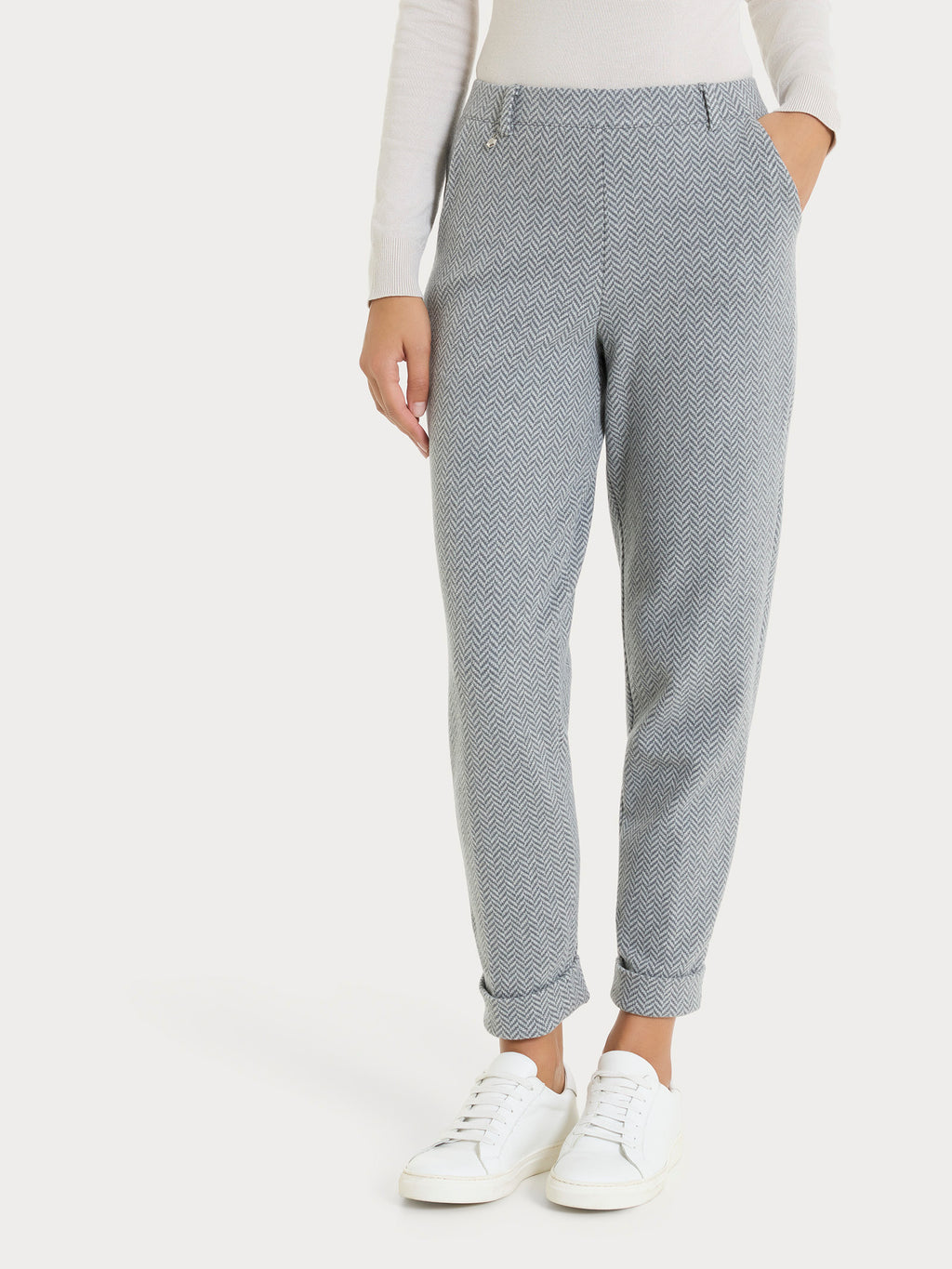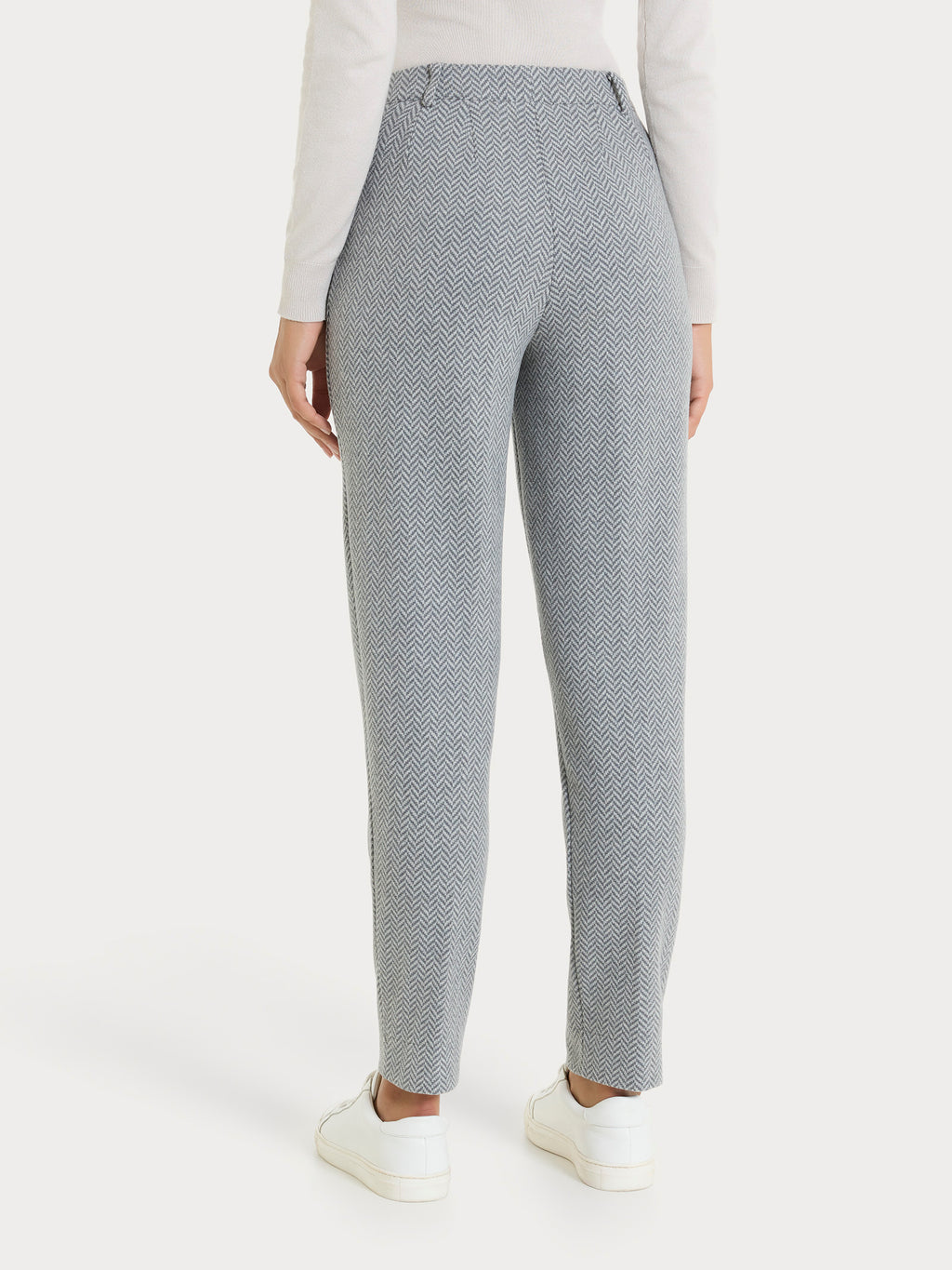 Realizzato in Eco Jacquard, un punto Milano elasticizzato che unisce la stabilità dei tessuti navetta con la flessibilità della maglia, permettendo la creazione di eleganti disegni tinto filo grazie alla tessitura jacquard.