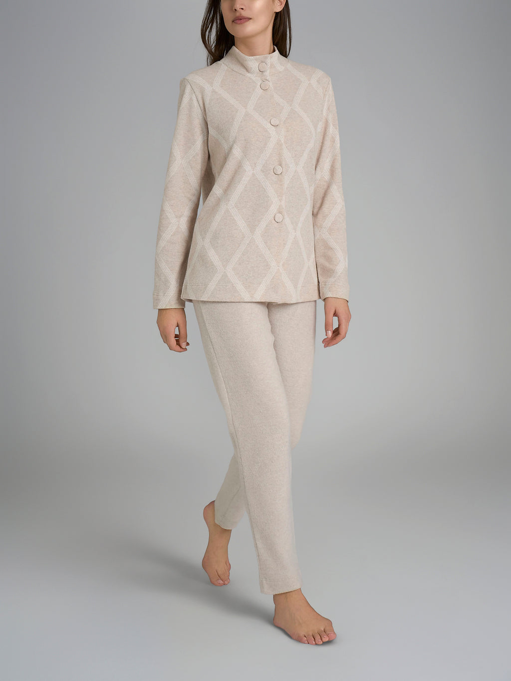 La combinazione di colori delicati dei pantaloni ai design geometrici presenti sulle casacche rende questo pigiama elegante e alla moda, perfetto per una serata rilassante a casa senza rinunciare allo stile.