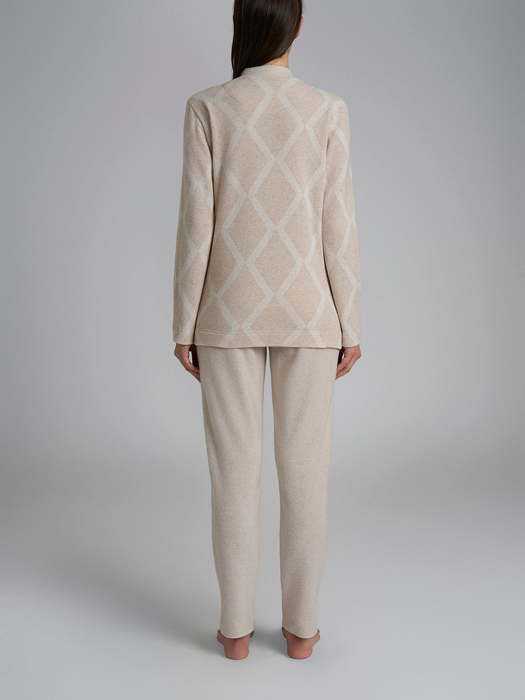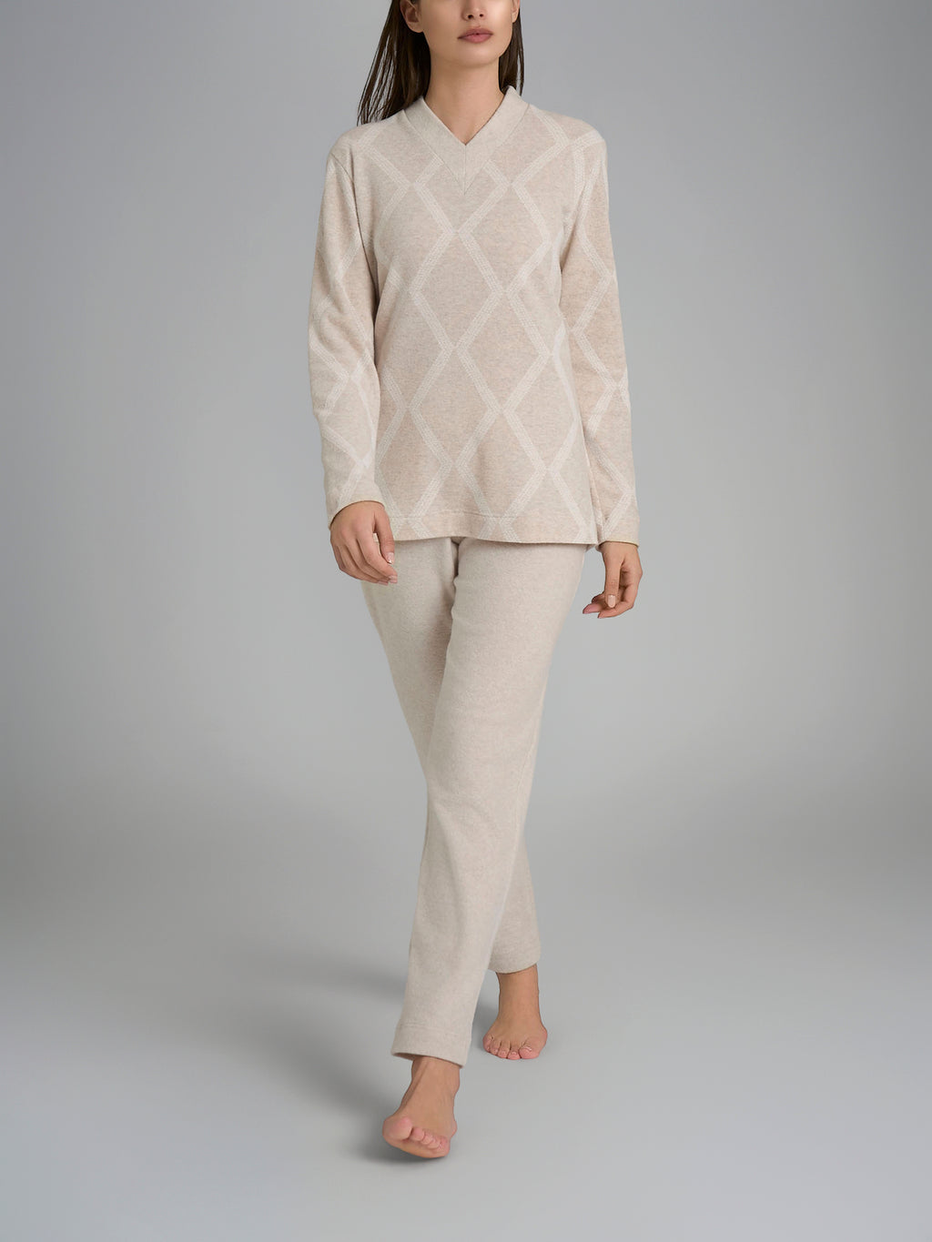 Il pigiama è composto da una casacca a manica lunga con scollo a V, progettata per offrire il giusto equilibrio tra comfort e femminilità.