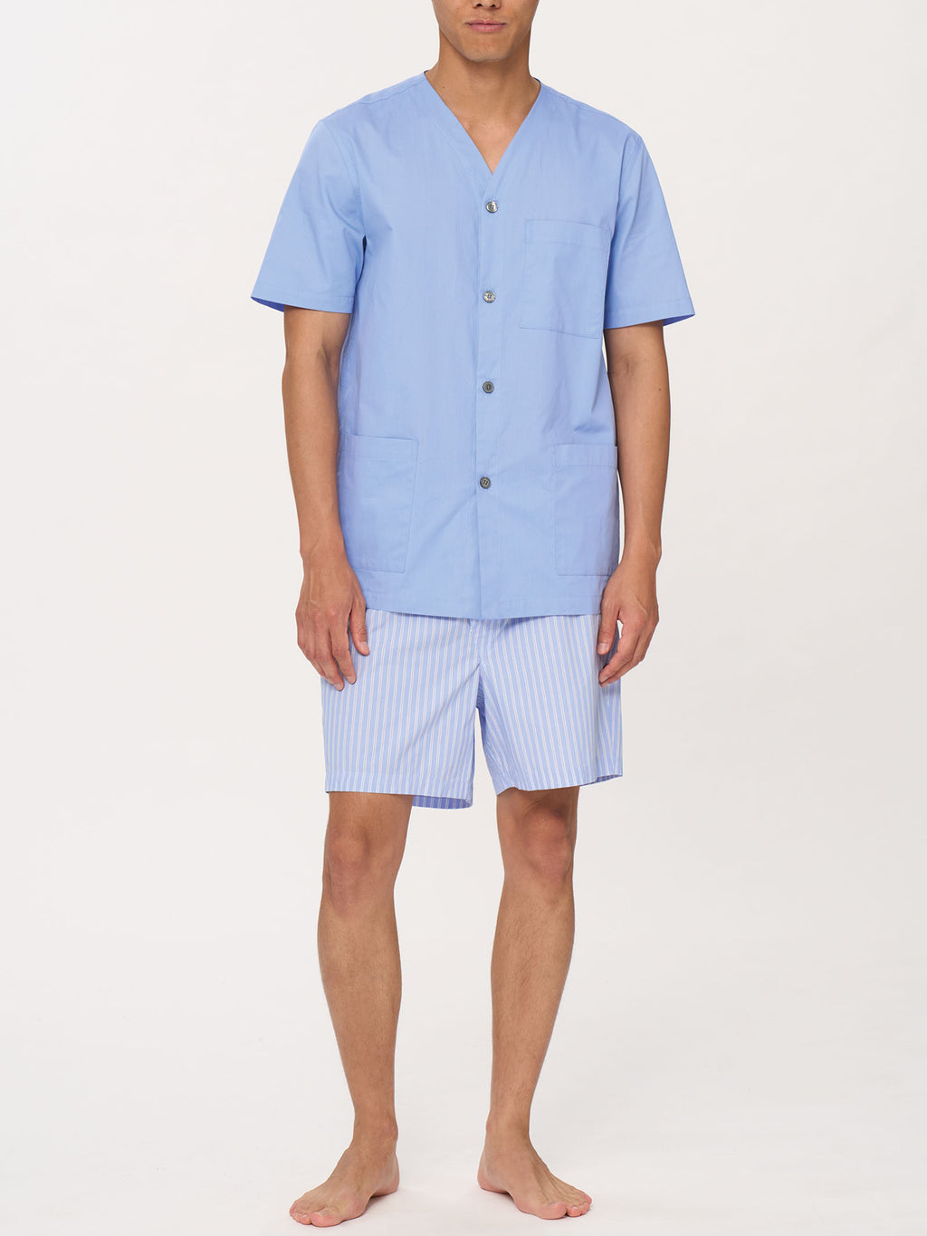 Pigiama corto in navetta di puro cotone tinto filo con camicia senza collo aperta con bottoni e tre tasche.