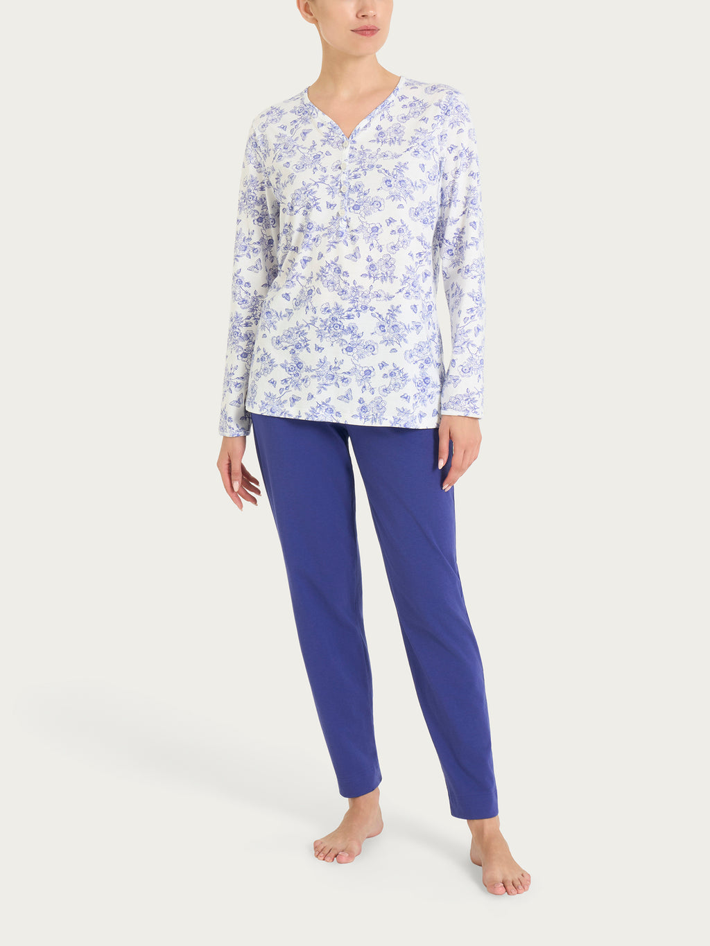 Disponibile in due fantasie dal carattere diverso: la versione con ciliegie porta un tocco fresco e vivace, ideale per chi ama dettagli allegri e femminili, mentre la variante toile de jouy regala un’eleganza più romantica e sofisticata, con un disegno ispirato alla tradizione che rende il pigiama speciale e ricercato.