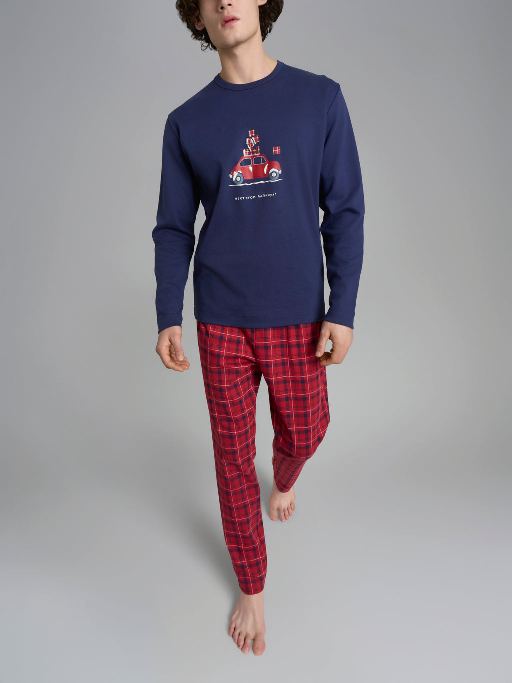 Questo completo si compone di una casacca blu tinta unita impreziosita da un delicato dettaglio che cattura lo sguardo, abbinata a un pantalone a fantasia tartan scozzese che richiama con stile i colori caldi e suggestivi del Natale.