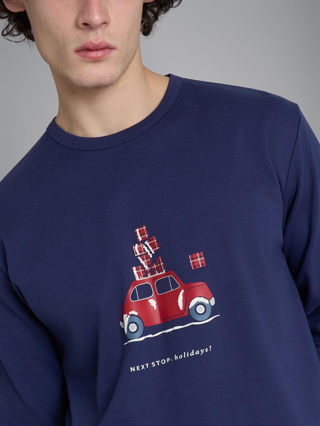 Il pigiama girocollo da uomo con stampa in tema natalizio è un capo di abbigliamento confortevole e festivo, perfetto per celebrare la stagione natalizia con stile e allegria.
