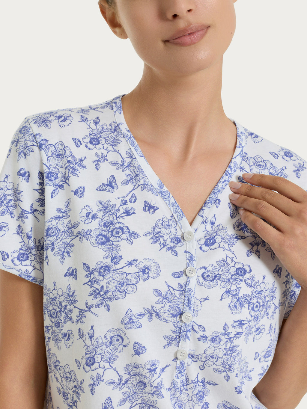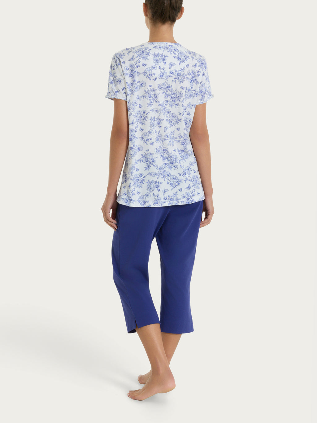 Un pigiama curato e femminile, dove fantasia e dettagli si incontrano per vestire il riposo con stile.