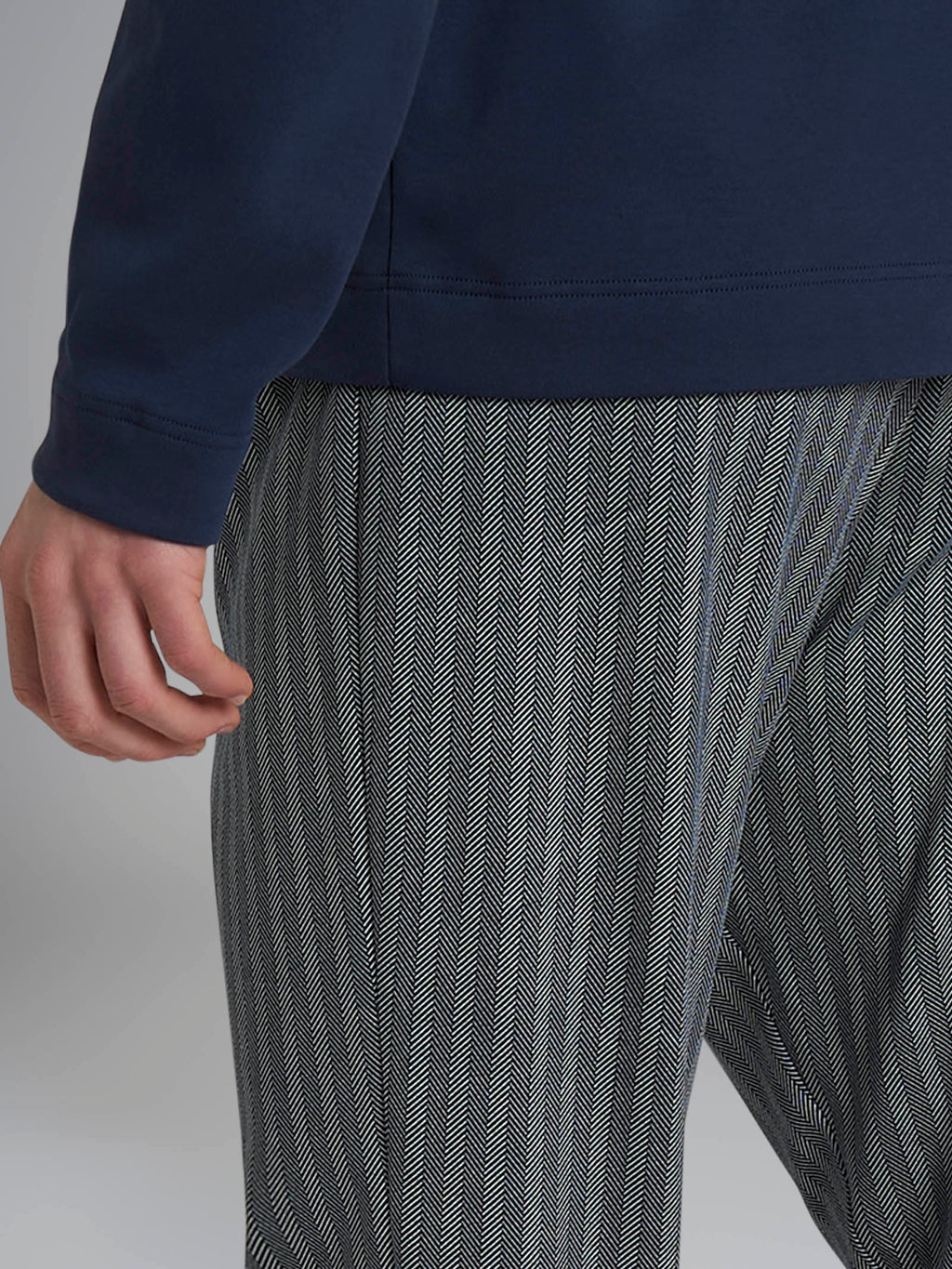 Questo capo è composto da una casacca tinta unita e da un pantalone a gamba dritta con micro fantasia spigata bicolore per un look notturno moderno e ricercato.