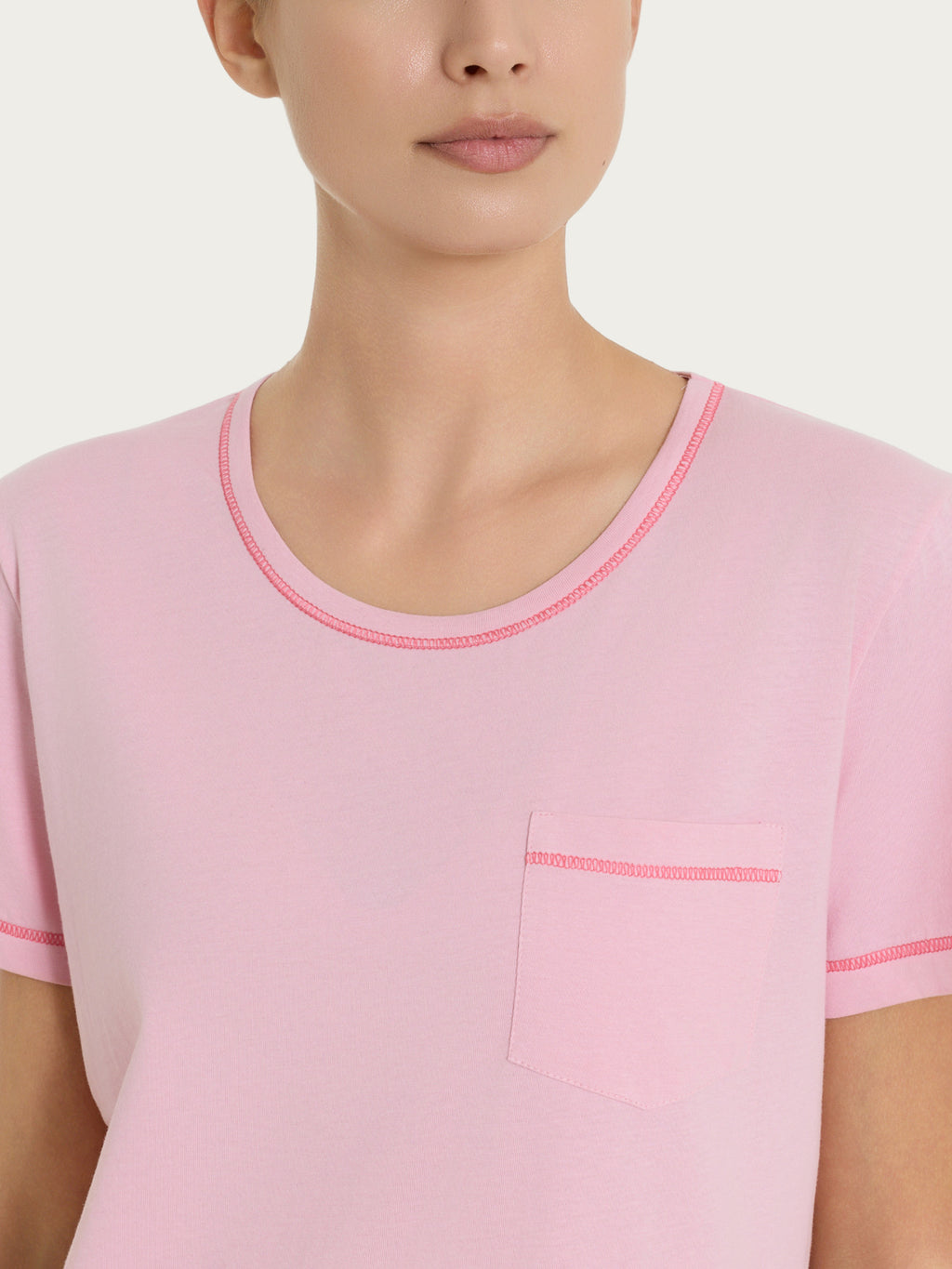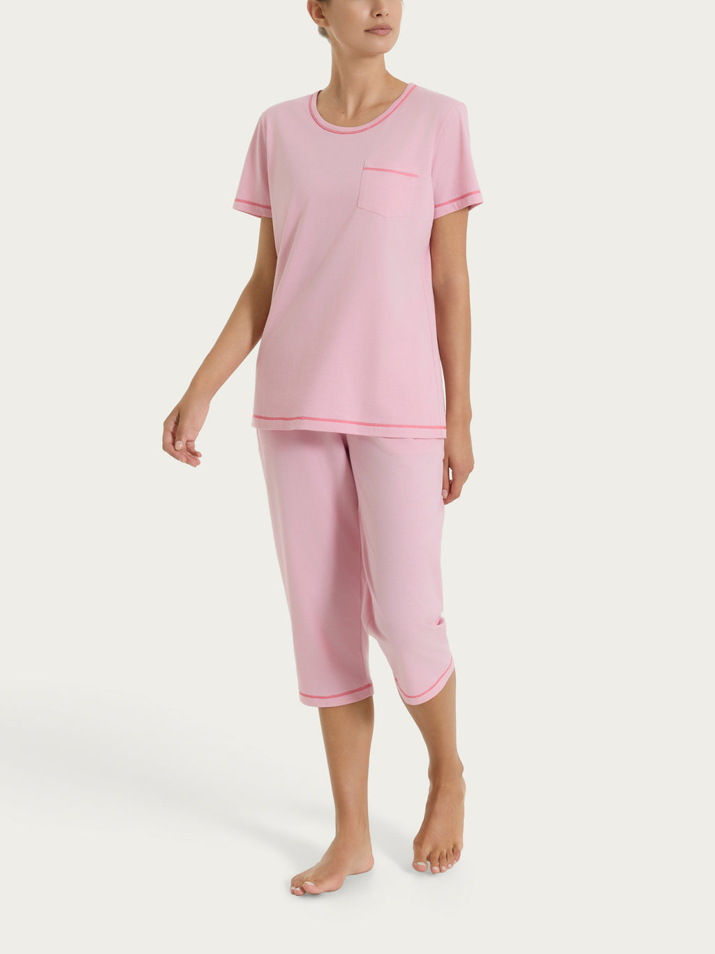 Fresco, moderno e curato nei dettagli: un pigiama che rende speciale anche il relax.Il modello è composto da una maglietta girocollo a manica corta, pen...