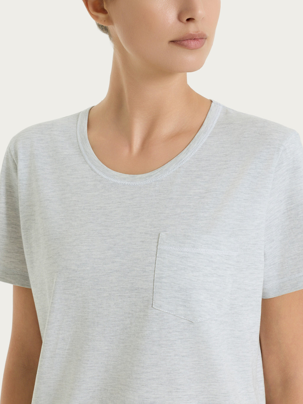 Il modello è composto da una maglietta girocollo a manica corta, pensata per offrire una vestibilità leggera e confortevole. Il taschino applicato sul petto aggiunge un accento pratico e contemporaneo, mentre le cuciture a contrasto definiscono il design con un tocco grafico discreto, valorizzando la semplicità della tinta unita.