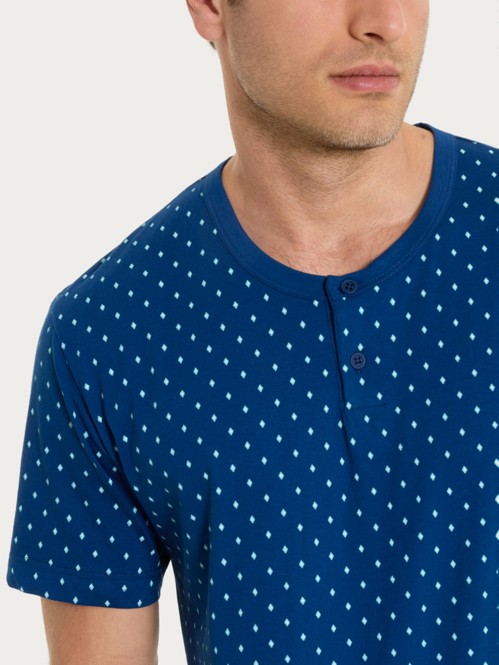 La casacca a manica corta è caratterizzata da una fantasia geometrica a micro rombi all over dallo stile classico e senza tempo, un pratico collo a serafino e una delicata bordatura sul collo che richiama il colore tinta unita del pantalone.