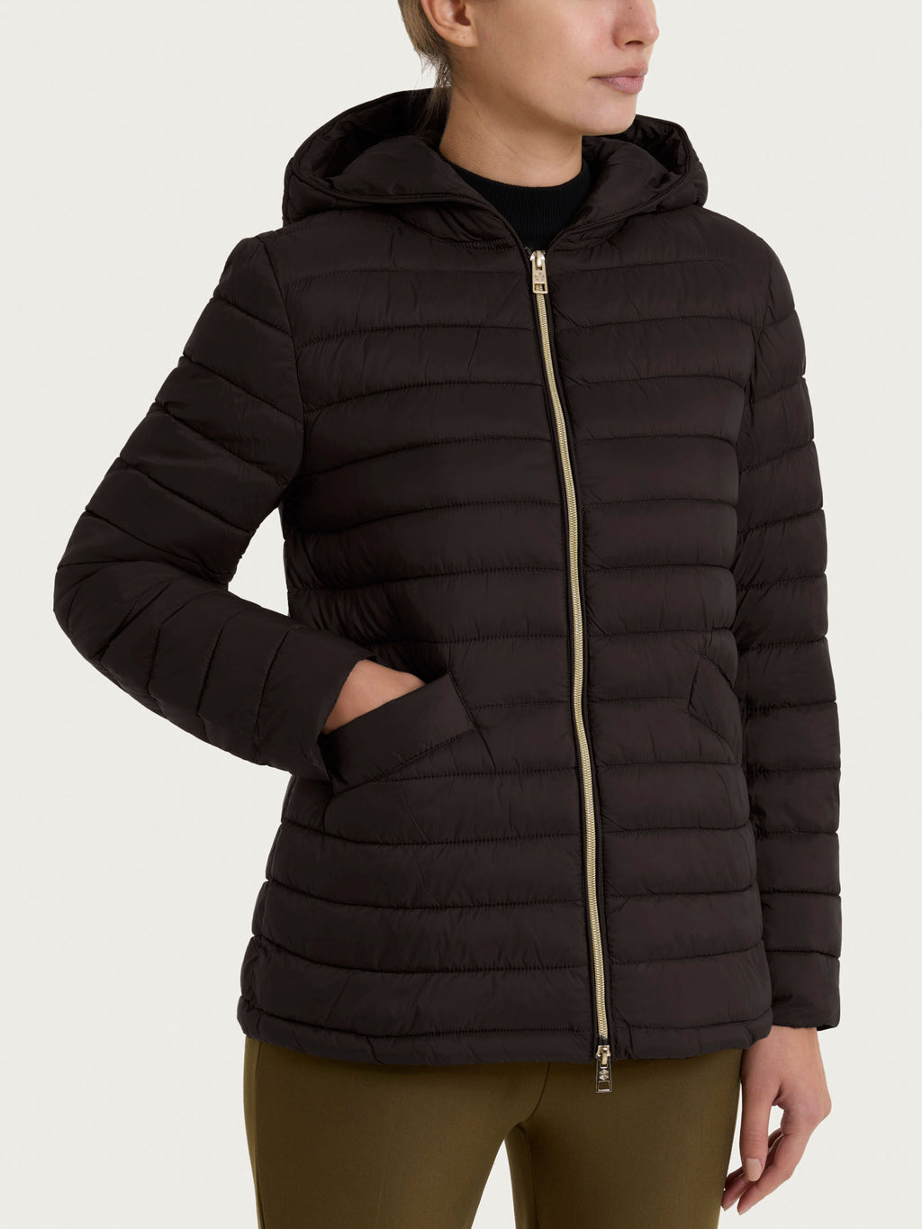 Piumino con cappuccio da donna con chiusura frontale con zip e pratiche tasche.