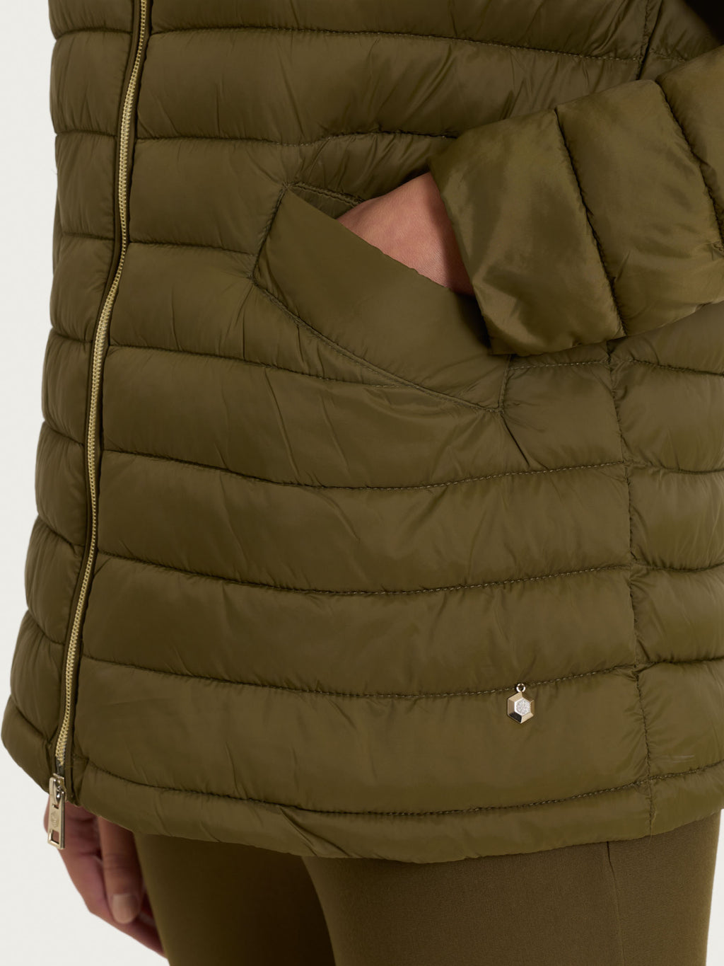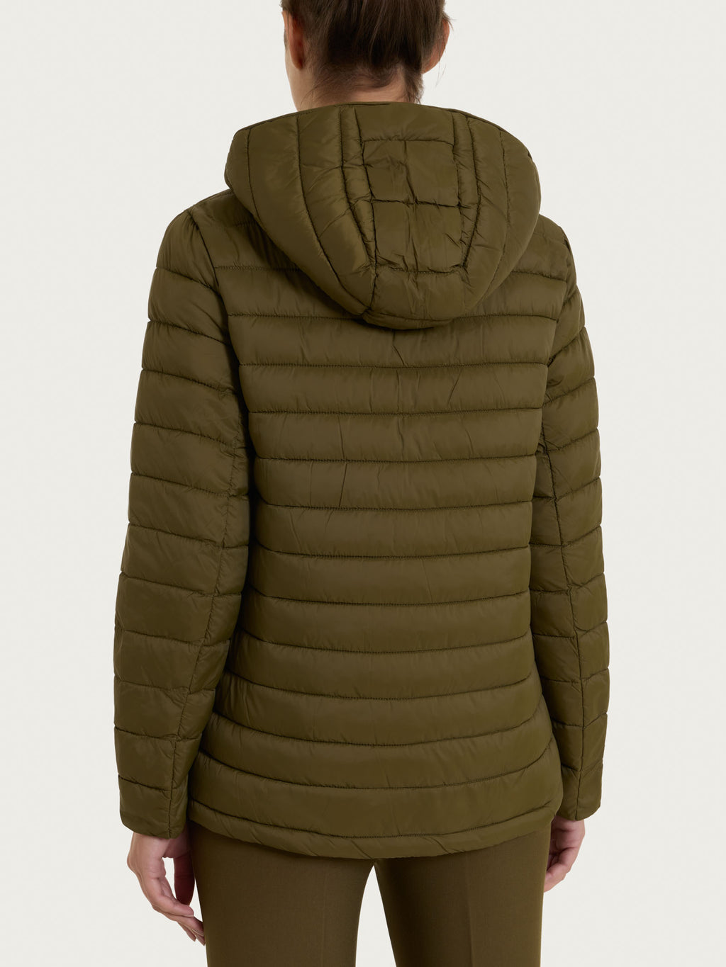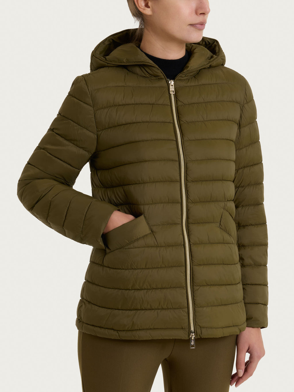 Piumino con cappuccio da donna con chiusura frontale con zip e pratiche tasche.