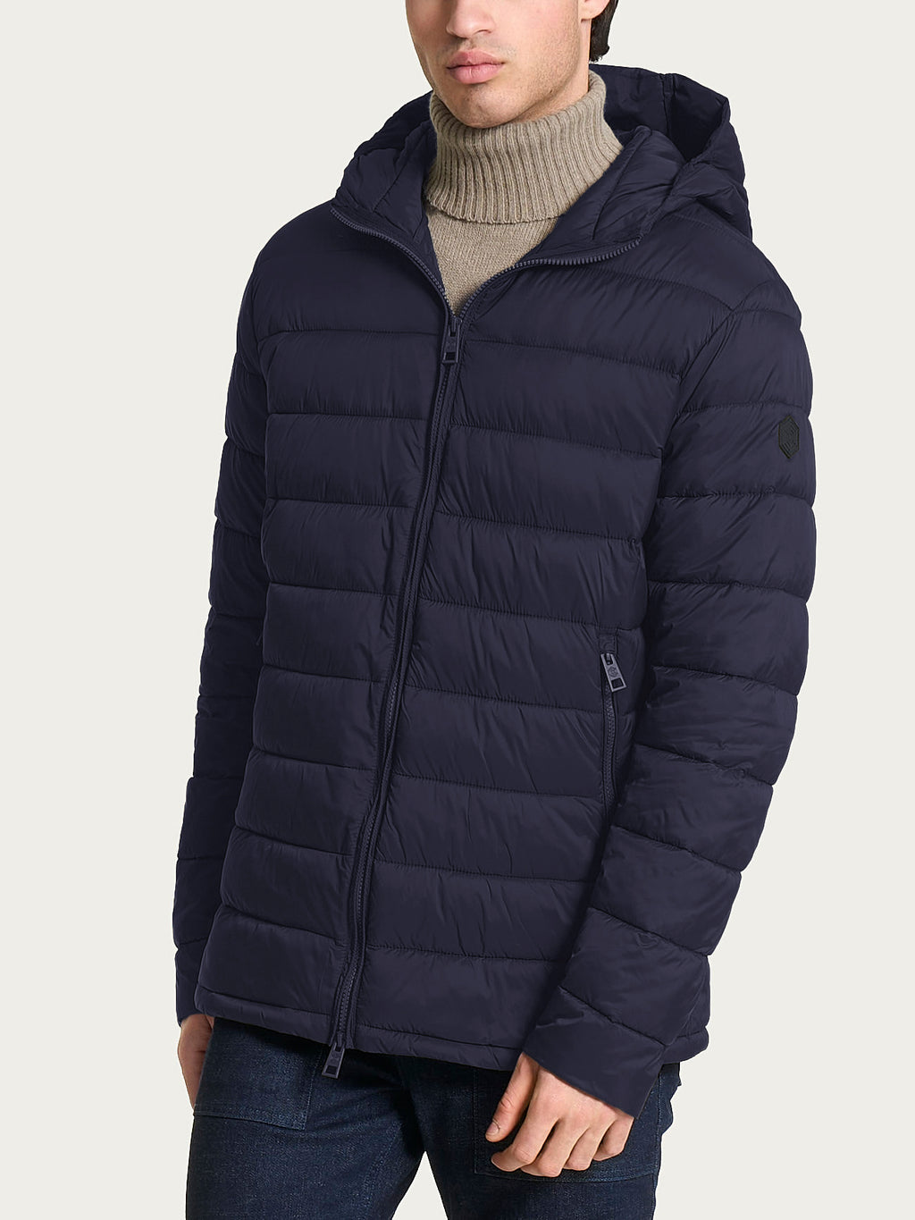 Piumino con cappuccio da uomo con chiusura frontale con zip a doppio cursore e pratiche tasche laterali chiuse da zip.