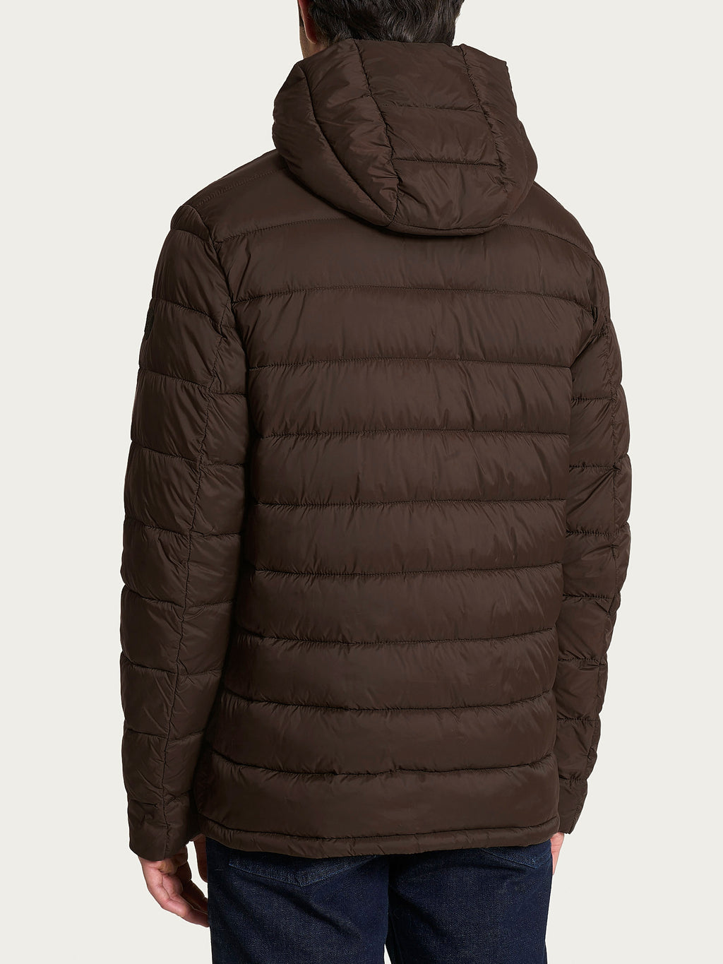 Piumino con cappuccio da uomo con chiusura frontale con zip a doppio cursore e pratiche tasche laterali chiuse da zip.