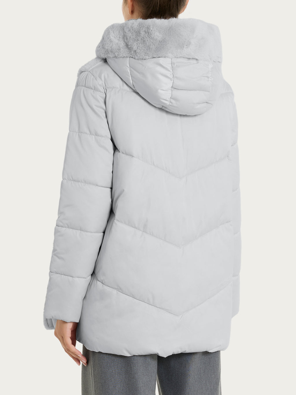 Piumino con cappuccio da donna con chiusura frontale con zip e pratiche tasche laterali.
