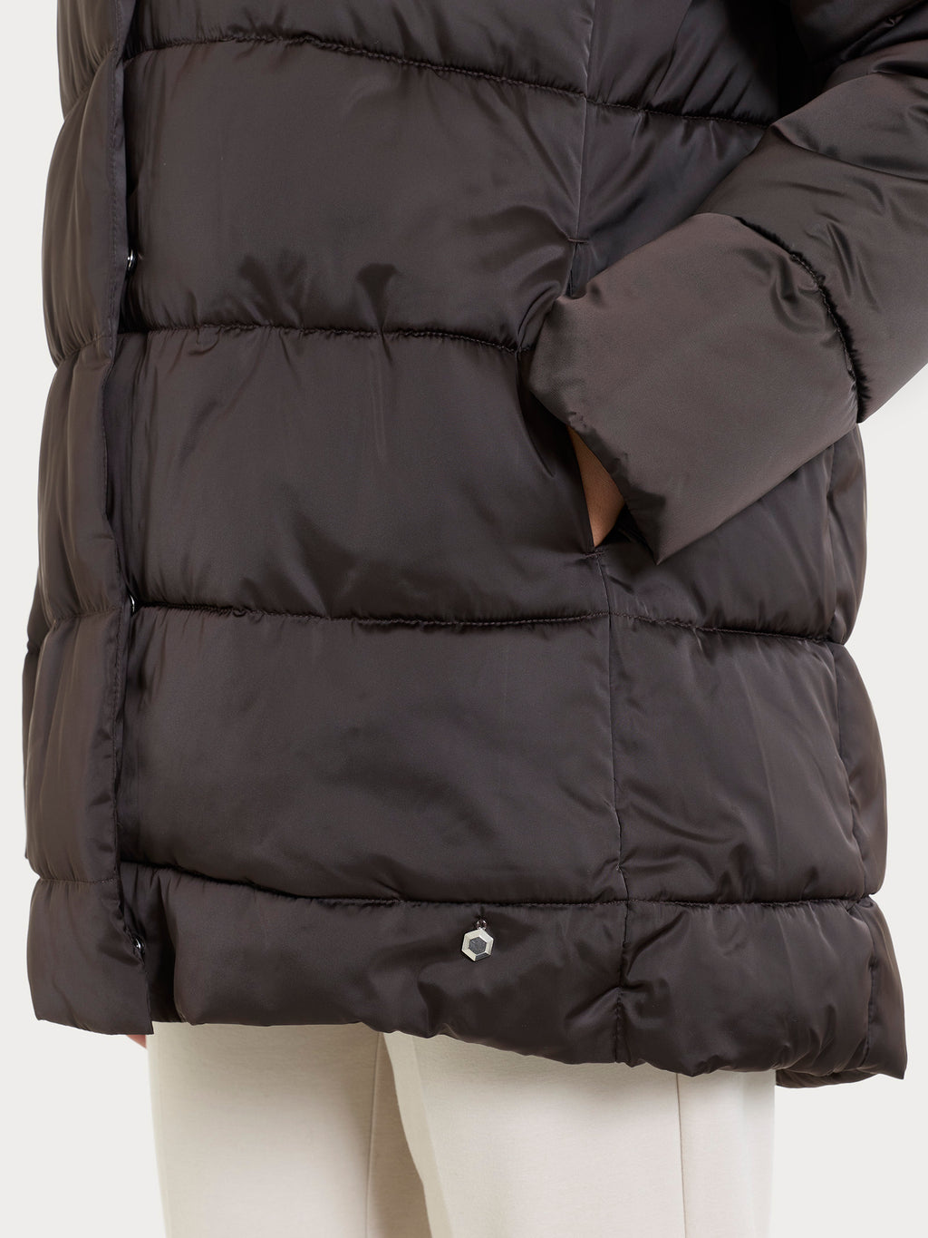 Piumino con cappuccio da donna con chiusura frontale con bottoni a pressione e pratiche tasche laterali.