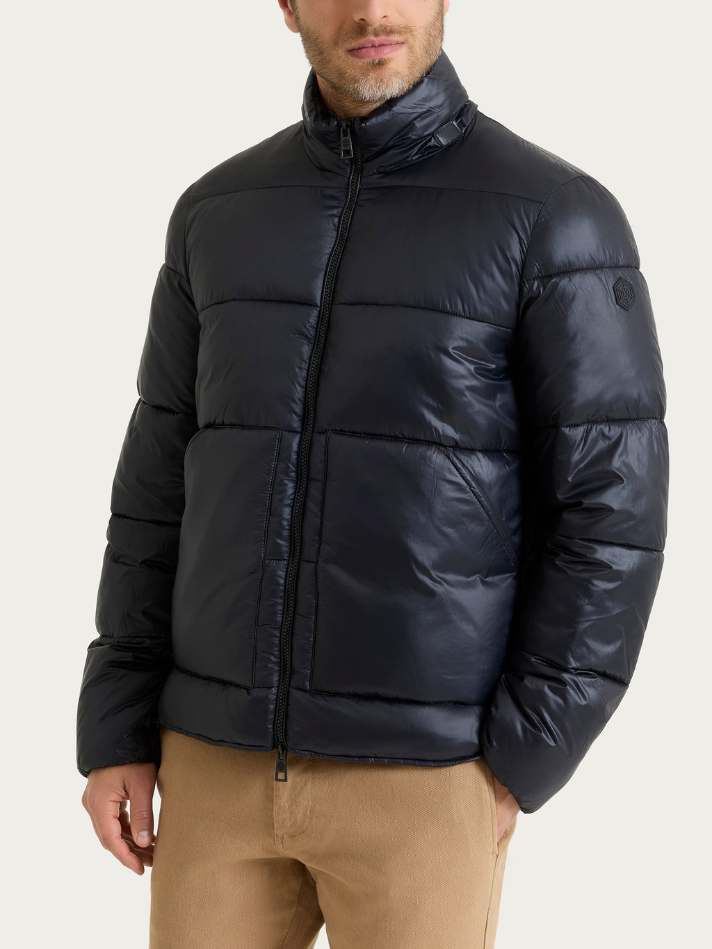 Piumino corto da uomo con chiusura frontale con zip e pratiche tasche laterali.