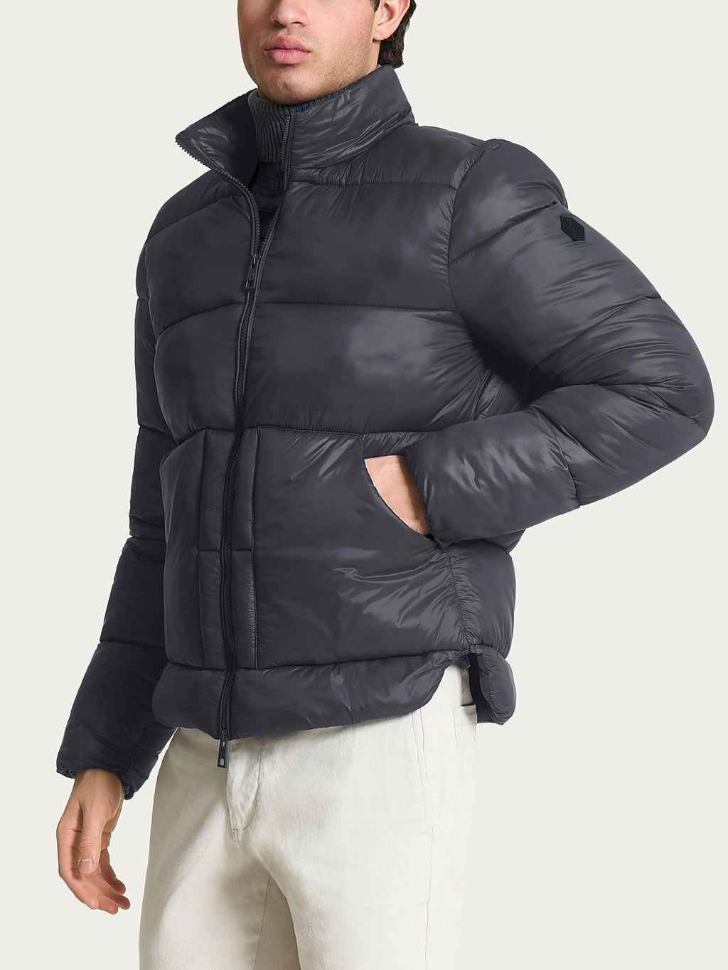 Piumino corto da uomo con chiusura frontale con zip e pratiche tasche laterali.