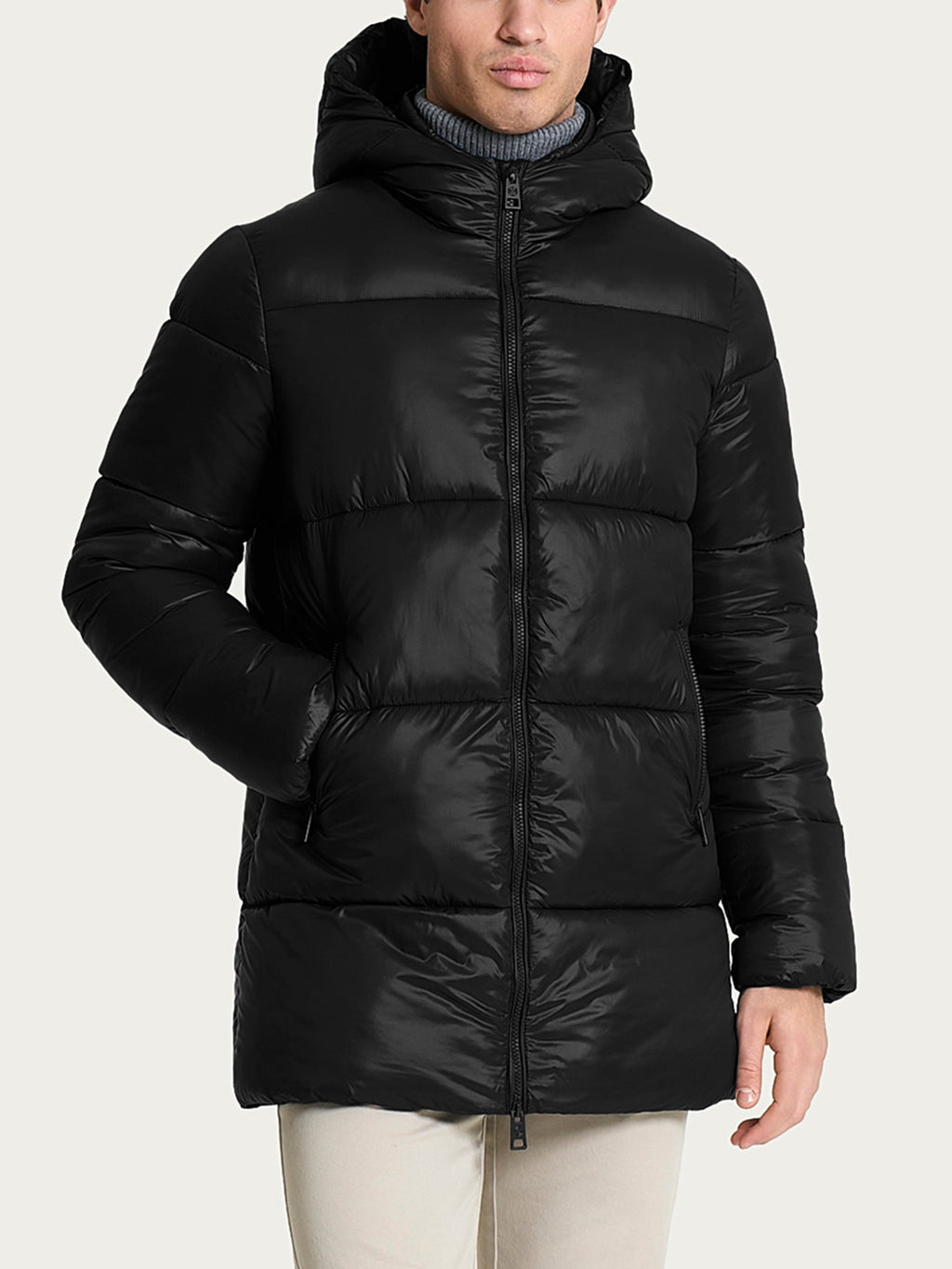 Piumino con cappuccio da uomo con chiusura frontale con zip e pratiche tasche laterali.